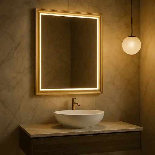 Rame LED cu finisaj auriu și iluminare uniformă, ideale pentru băi moderne și spații elegante.