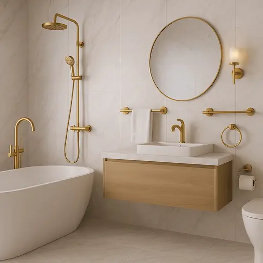Accesorii aurii practice și elegante — suporturi, dozatoare, cuiere și alte detalii esențiale.