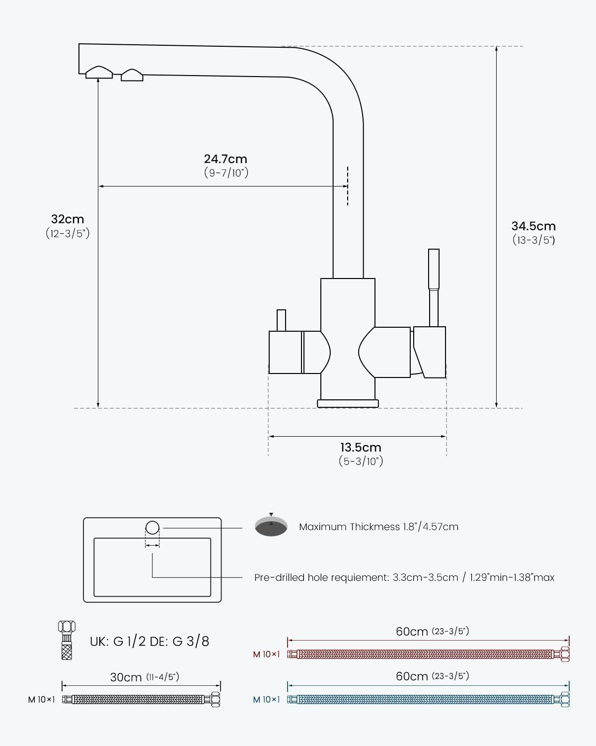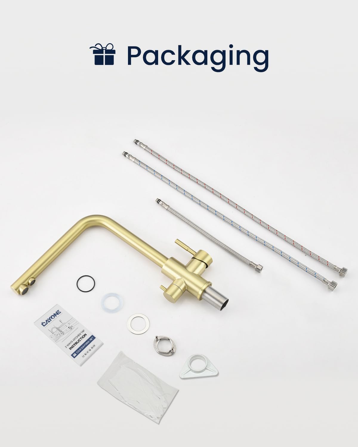 - Included Components1 * DAYONE 3 in 1 Kitchen Sink Tap, 1 * Gravity Ball & 1 * Installation Guide, 1 * Triangular plate, 3 * Supply Hose, Some Mounting Hardware
