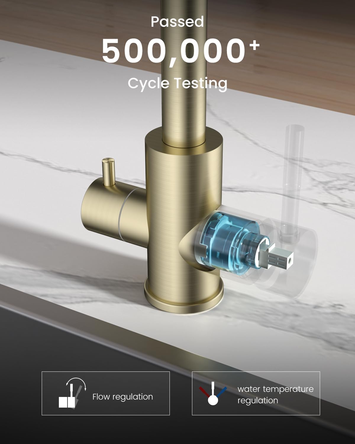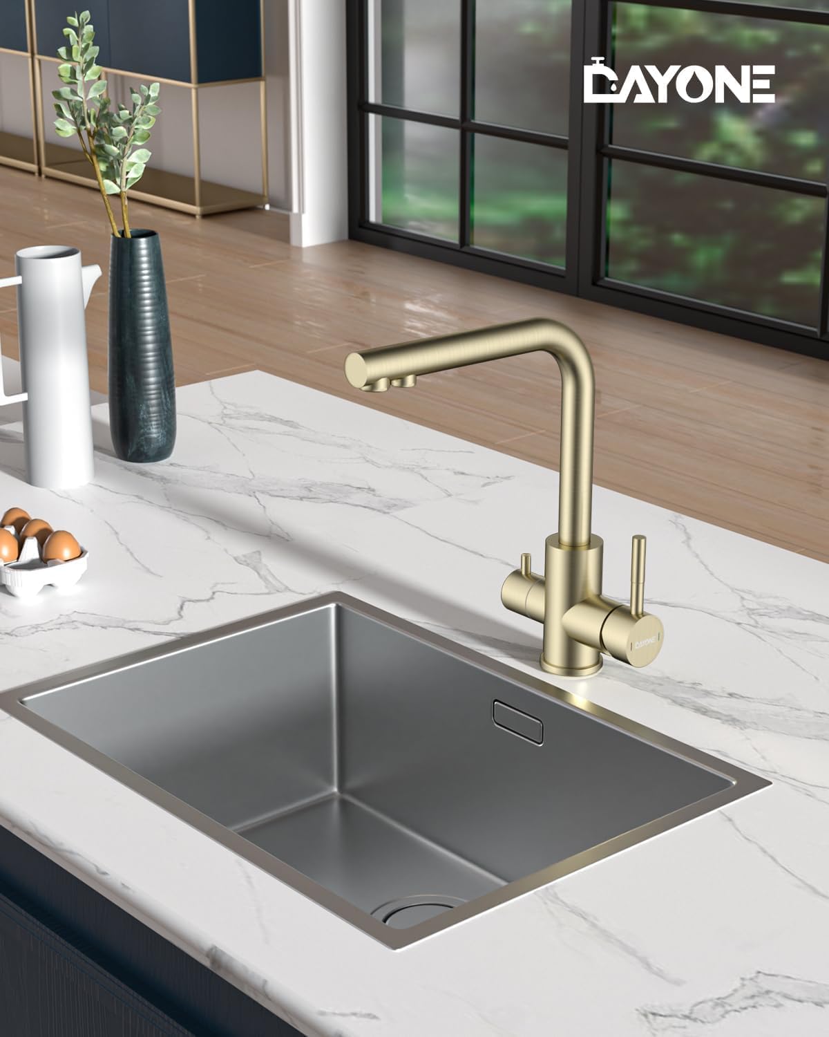 Bateria DAYONE 3 în 1 combină apa caldă, rece și apa potabilă filtrată într-un singur corp elegant. Finisajul brushed gold oferă un aspect modern și rafinat pentru orice bucătărie.