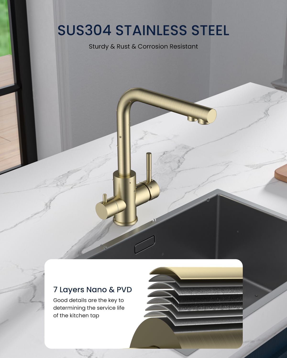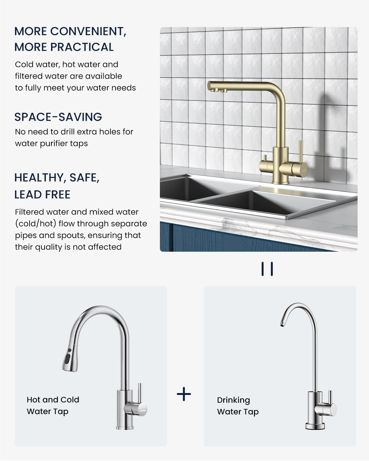 Baterie de bucătărie DAYONE 3 în 1 cu apă caldă, rece și potabilă într-un singur corp. Design dual lever cu conducte independente. Oțel inoxidabil SUS304, perlator ABS și rotație 360° pentru utilizare comodă și economie de spațiu și apă.