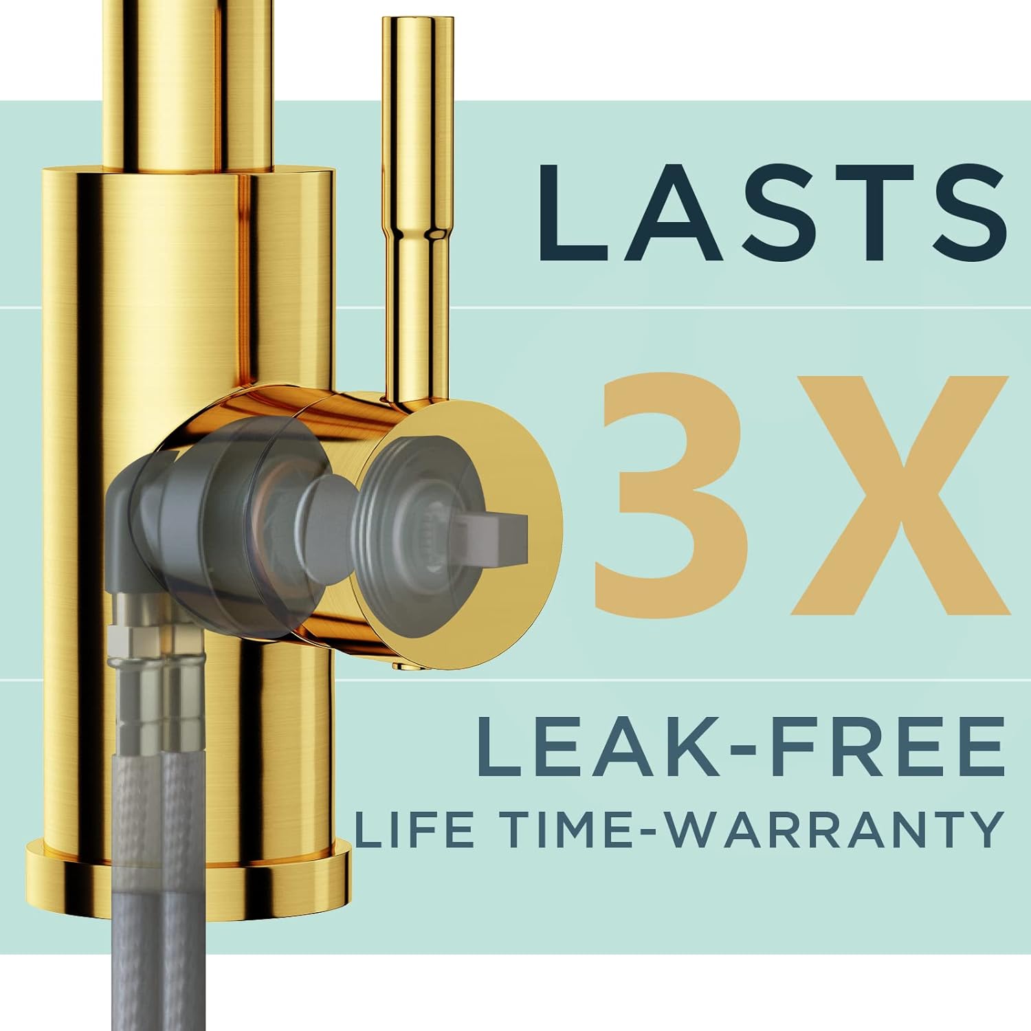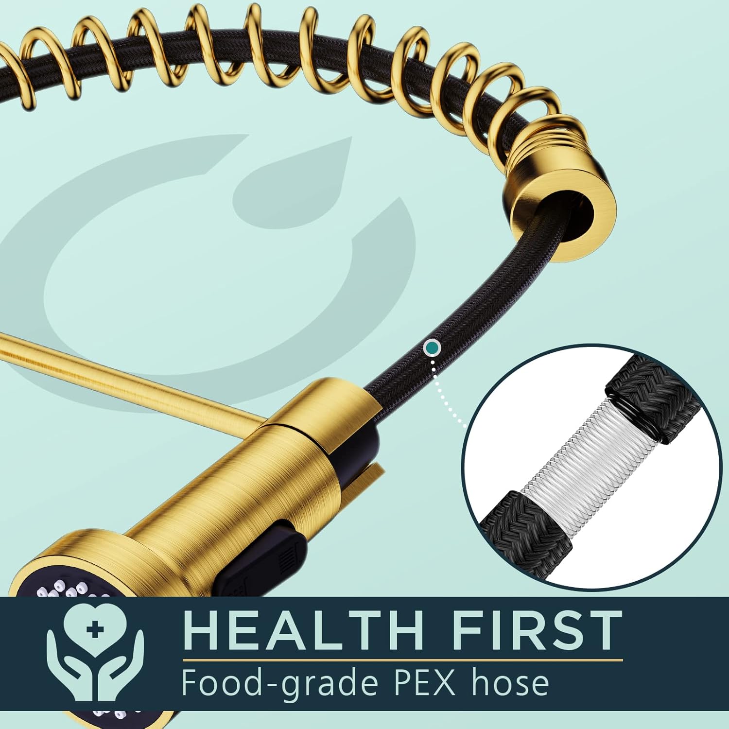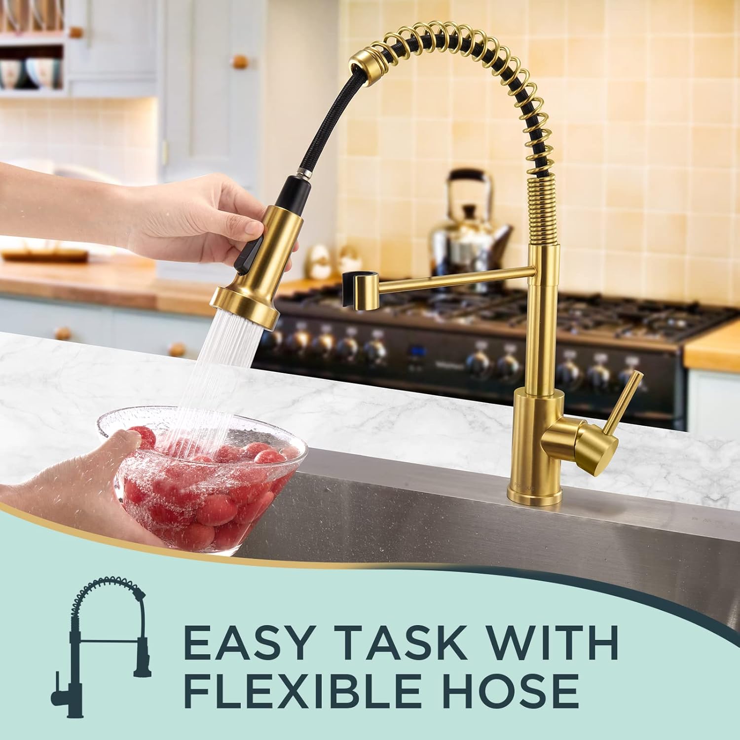 Baterie de bucătărie Forious cu arc înalt și finisaj Brushed Gold. Cap de duș cu 2 moduri, de la jet aerat la pulverizare puternică. Pipa rotativă 360° și mâner unic pentru control precis. Montaj prietenos DIY. Recomandată pentru sisteme cu 2,0–4,0 bar presiune.
