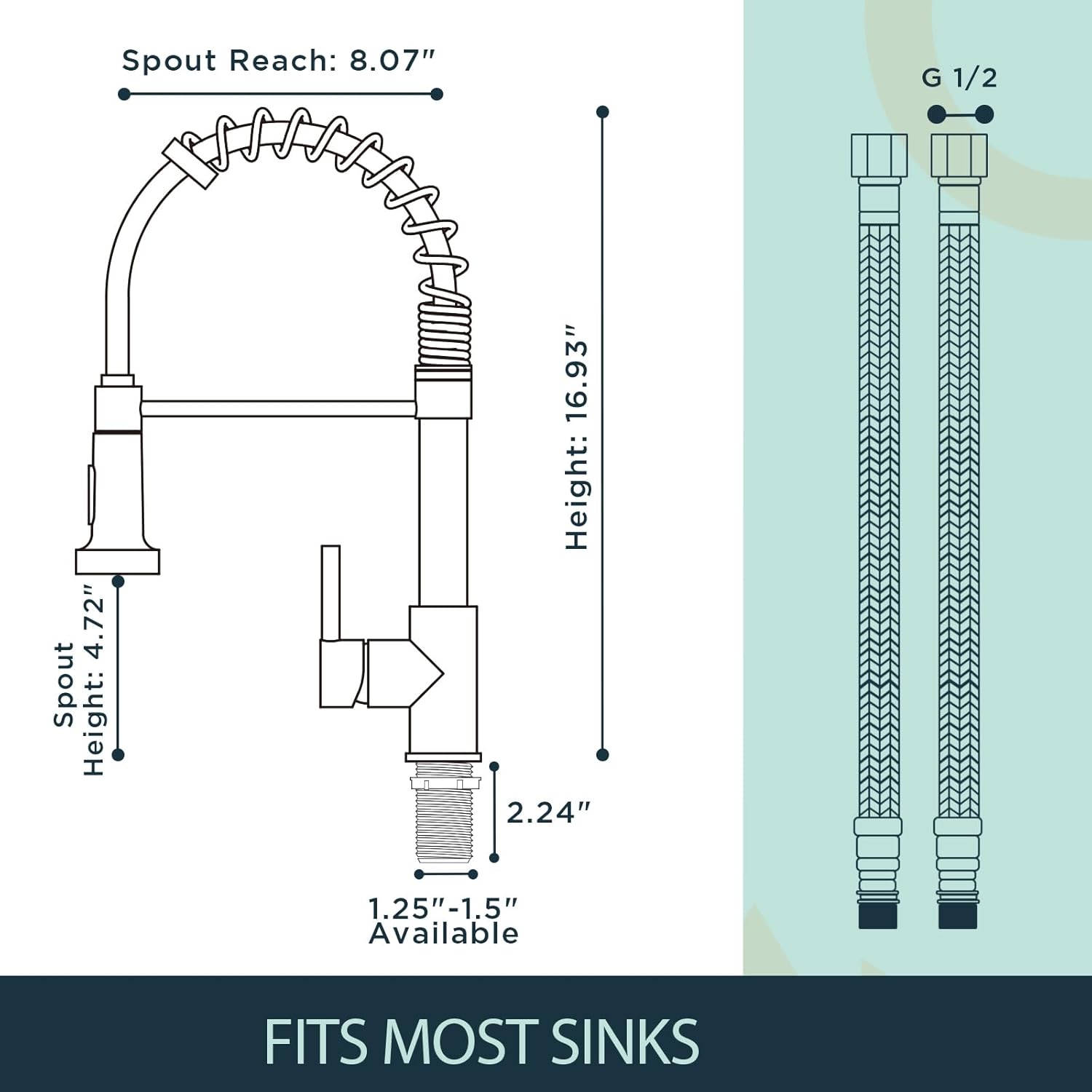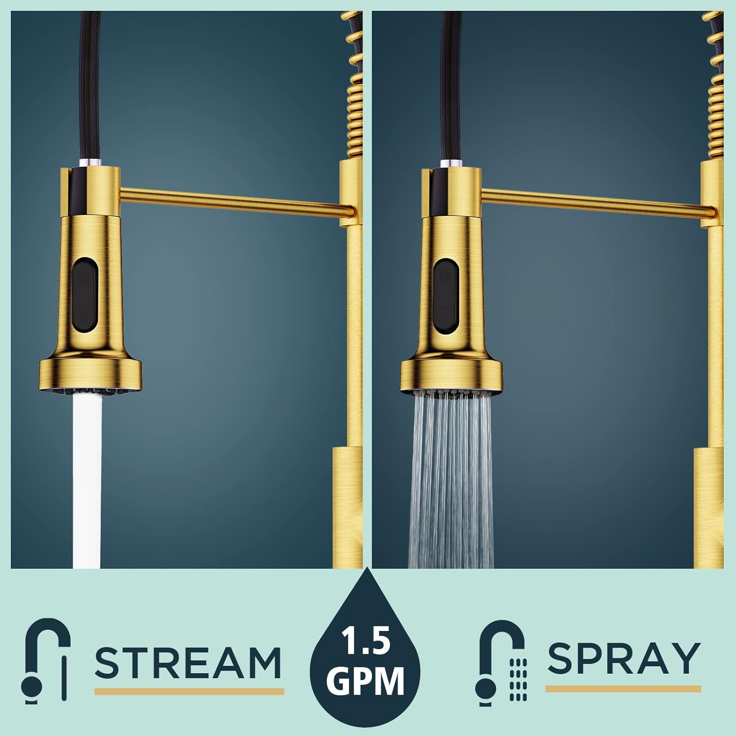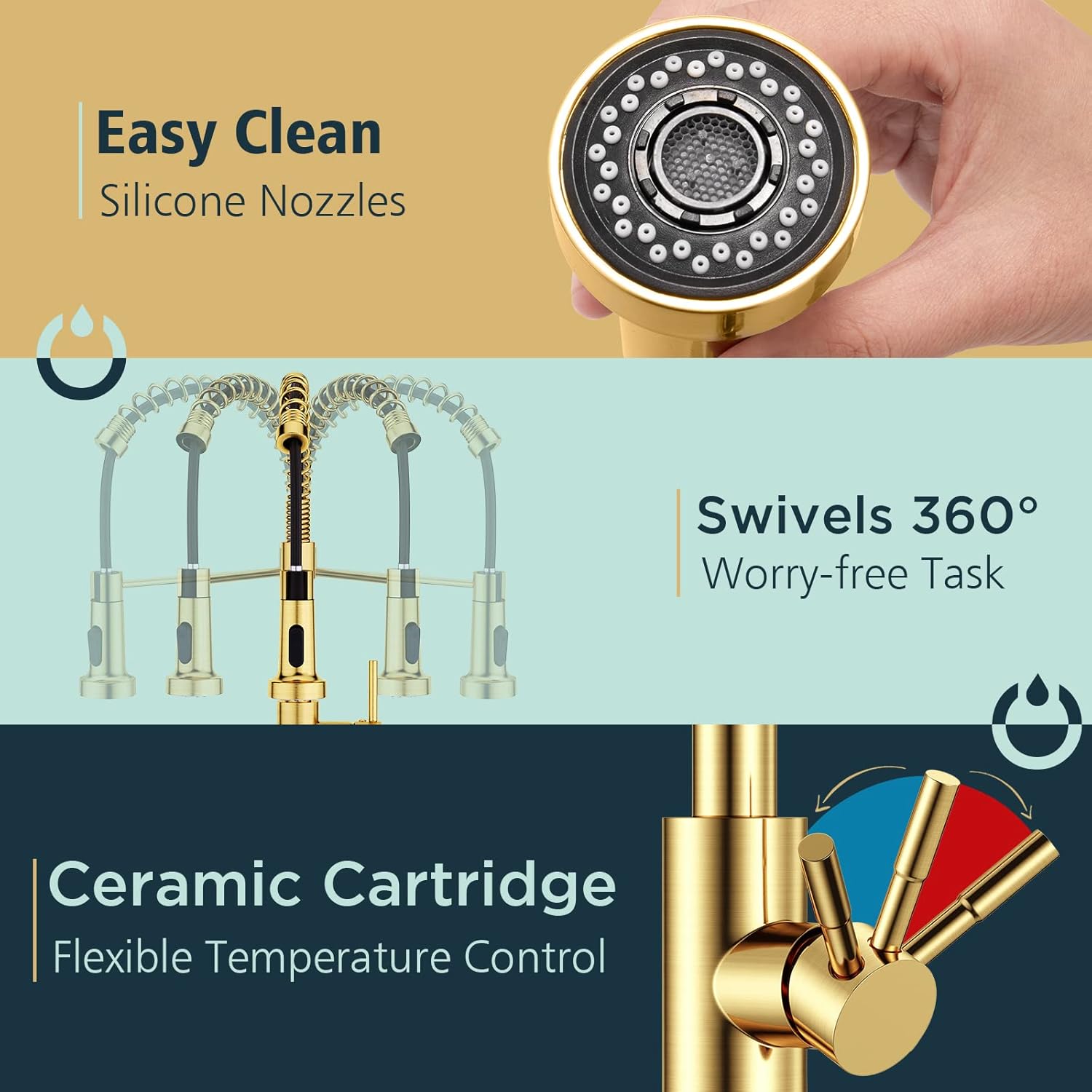 Baterie de bucătărie Forious cu arc înalt și finisaj Brushed Gold. Cap de duș cu 2 moduri, de la jet aerat la pulverizare puternică. Pipa rotativă 360° și mâner unic pentru control precis. Montaj prietenos DIY. Recomandată pentru sisteme cu 2,0–4,0 bar presiune.