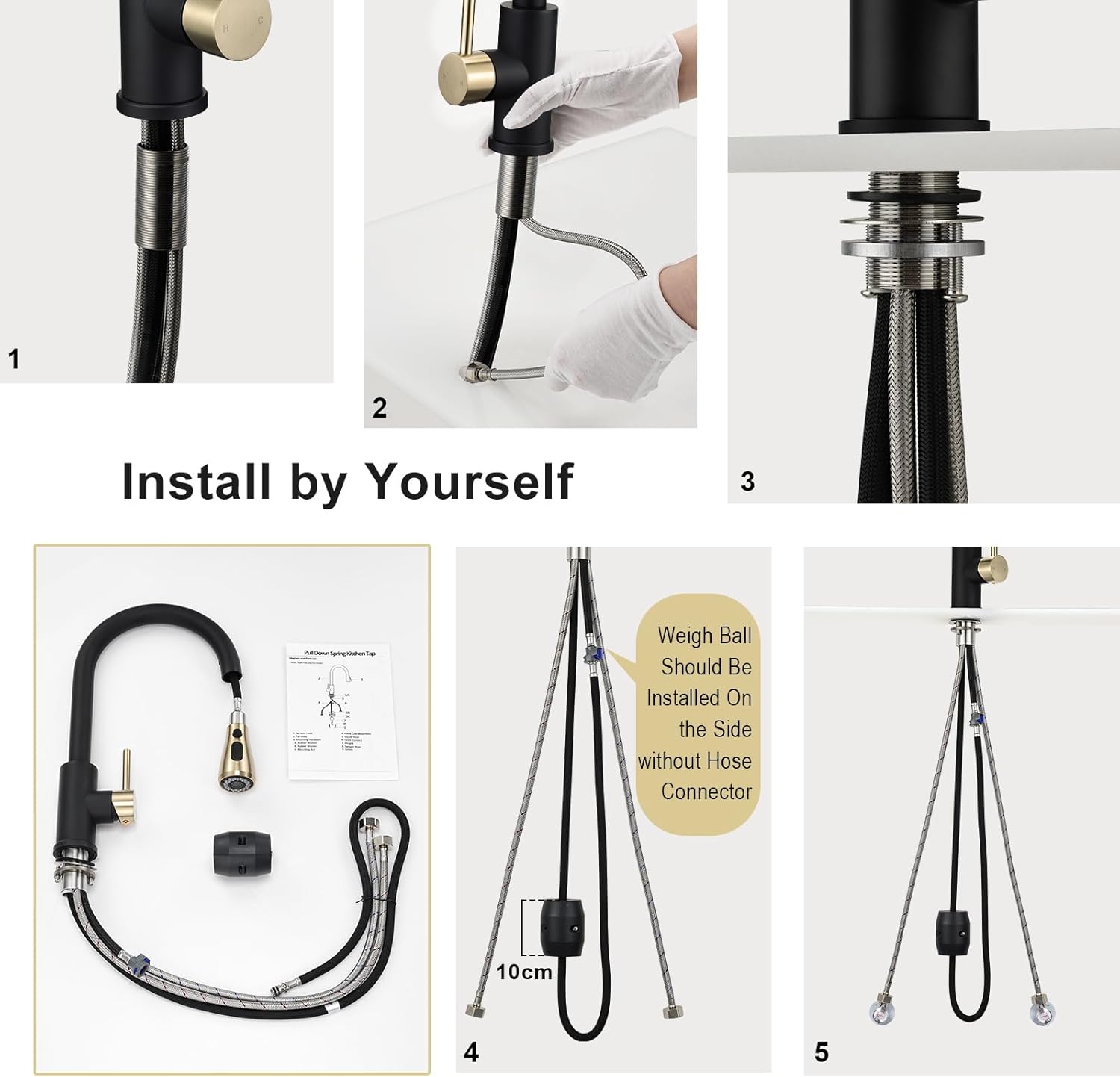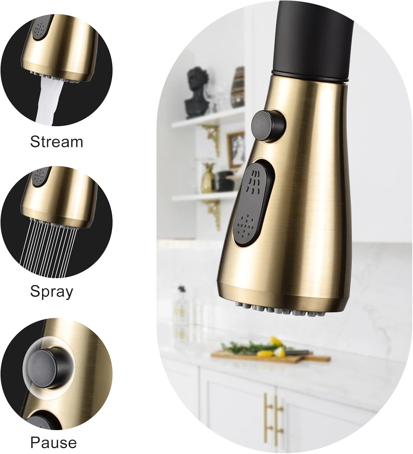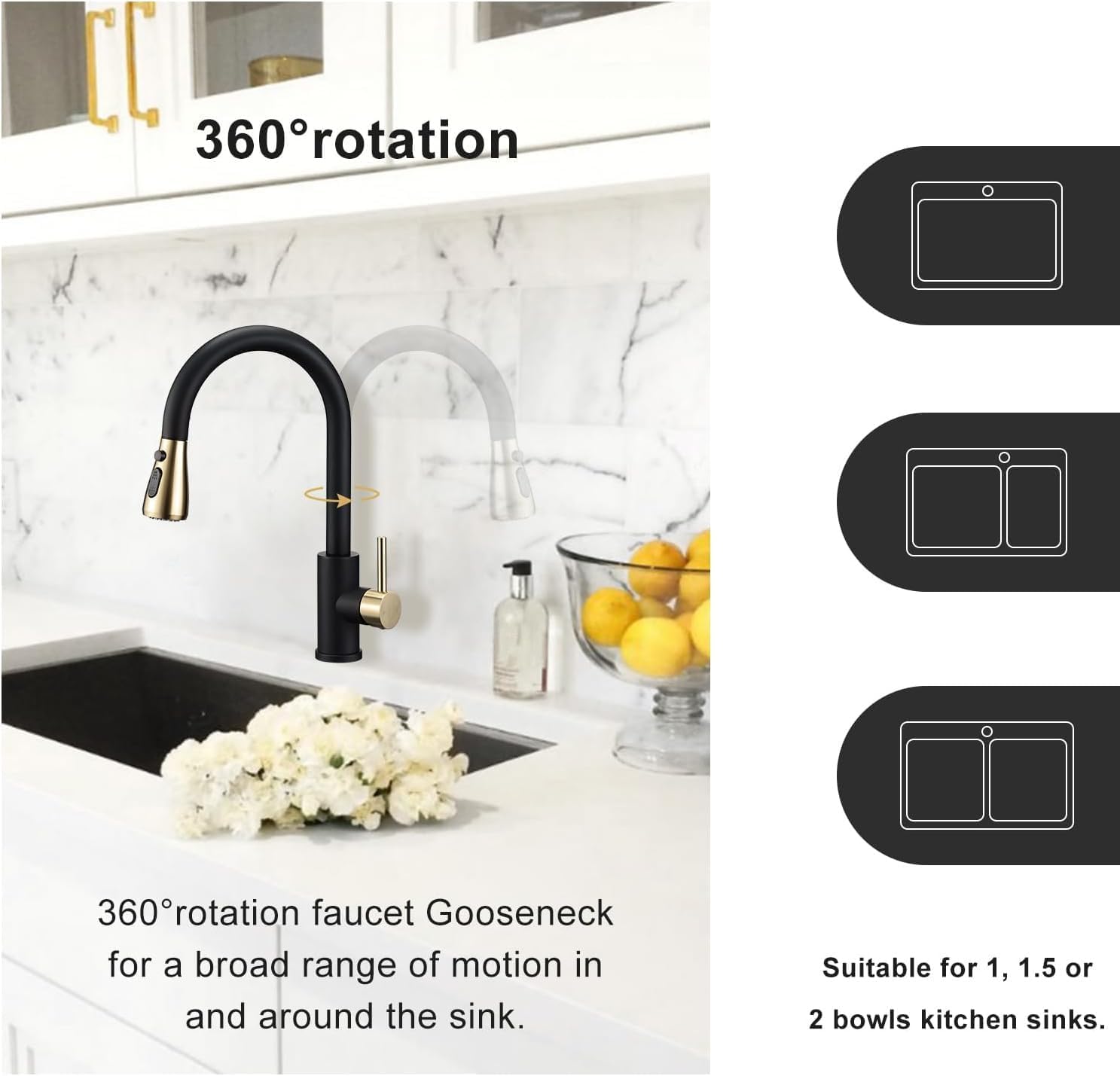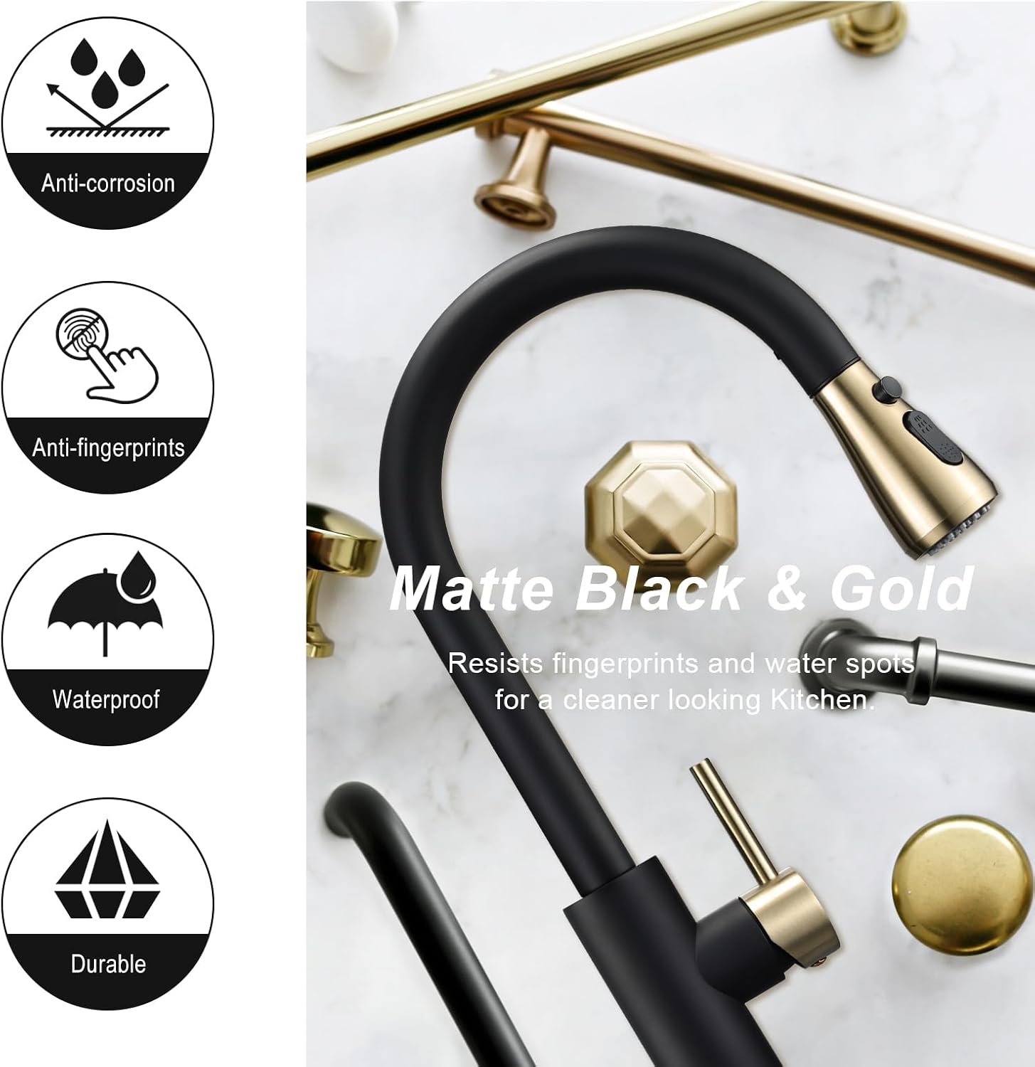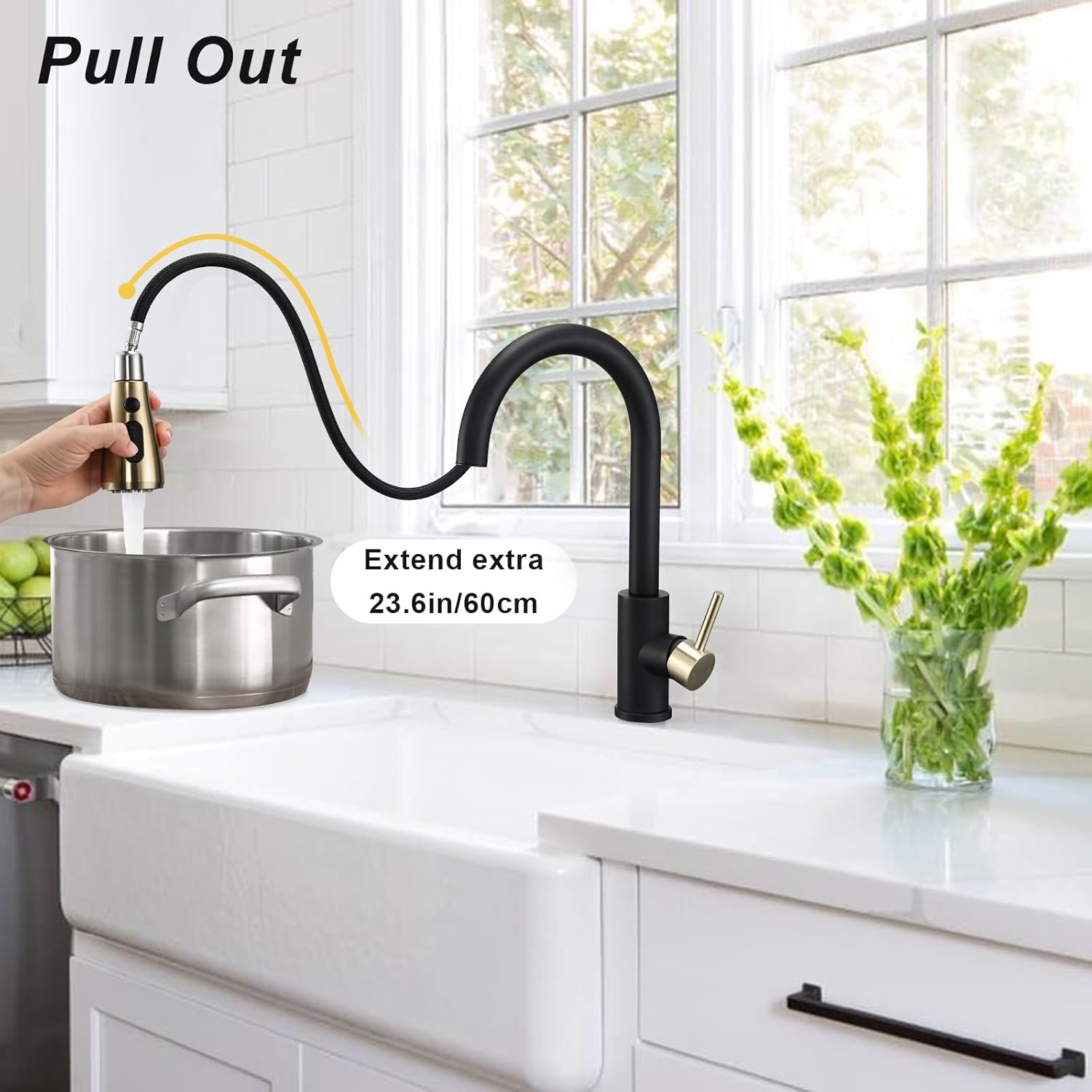Baterie de bucătărie negru mat și auriu, cu cap de duș extractibil și 3 moduri de pulverizare. Extensie 23,6 inch (≈ 59,9 cm) pentru acoperirea întregului chiuvetă. Finisaj rezistent la rugină, coroziune și urme de apă. Potrivită pentru bucătării moderne.