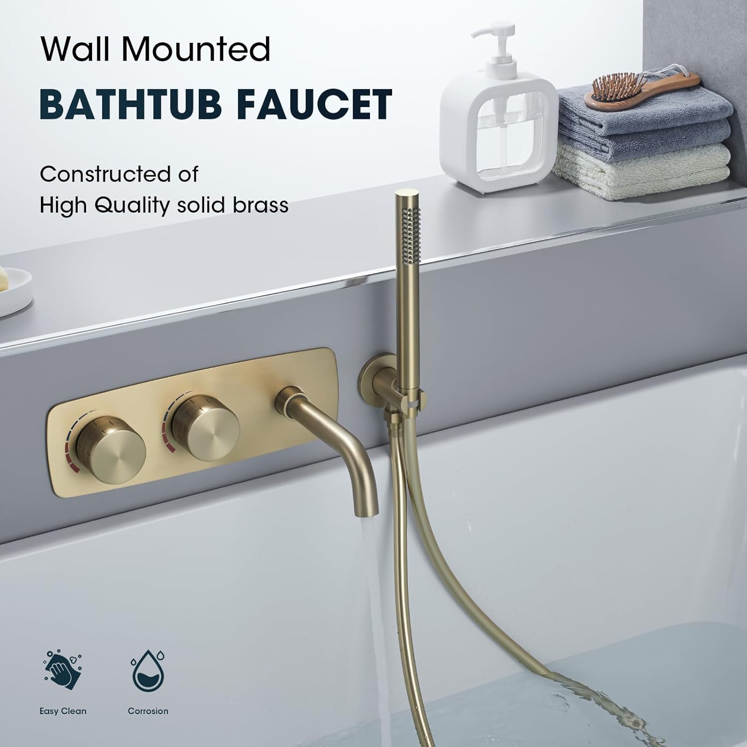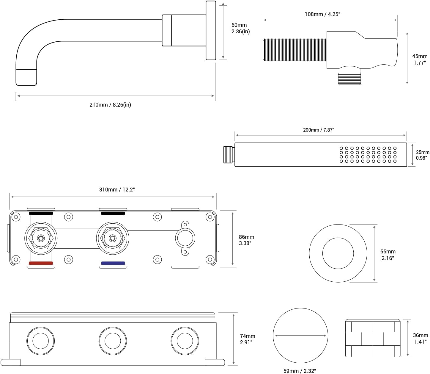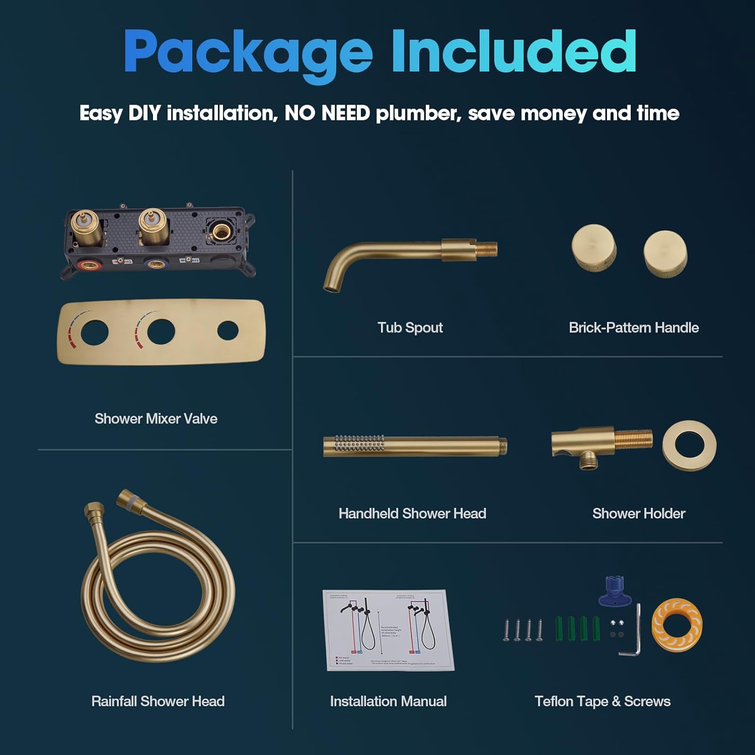 Pachetul include corpul de amestecare din alamă, mânere din alamă, gura de umplere cadă, suport duș din alamă, duș de mână din alamă, furtun de duș PVC și instrucțiuni de montaj.