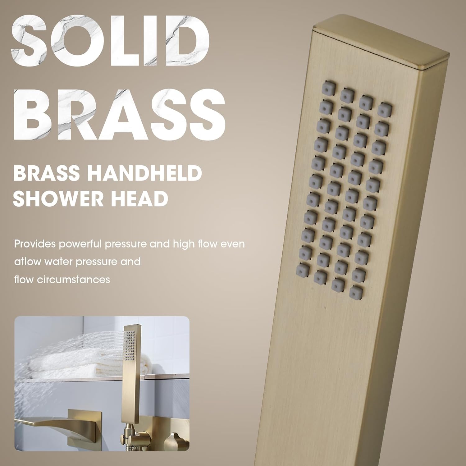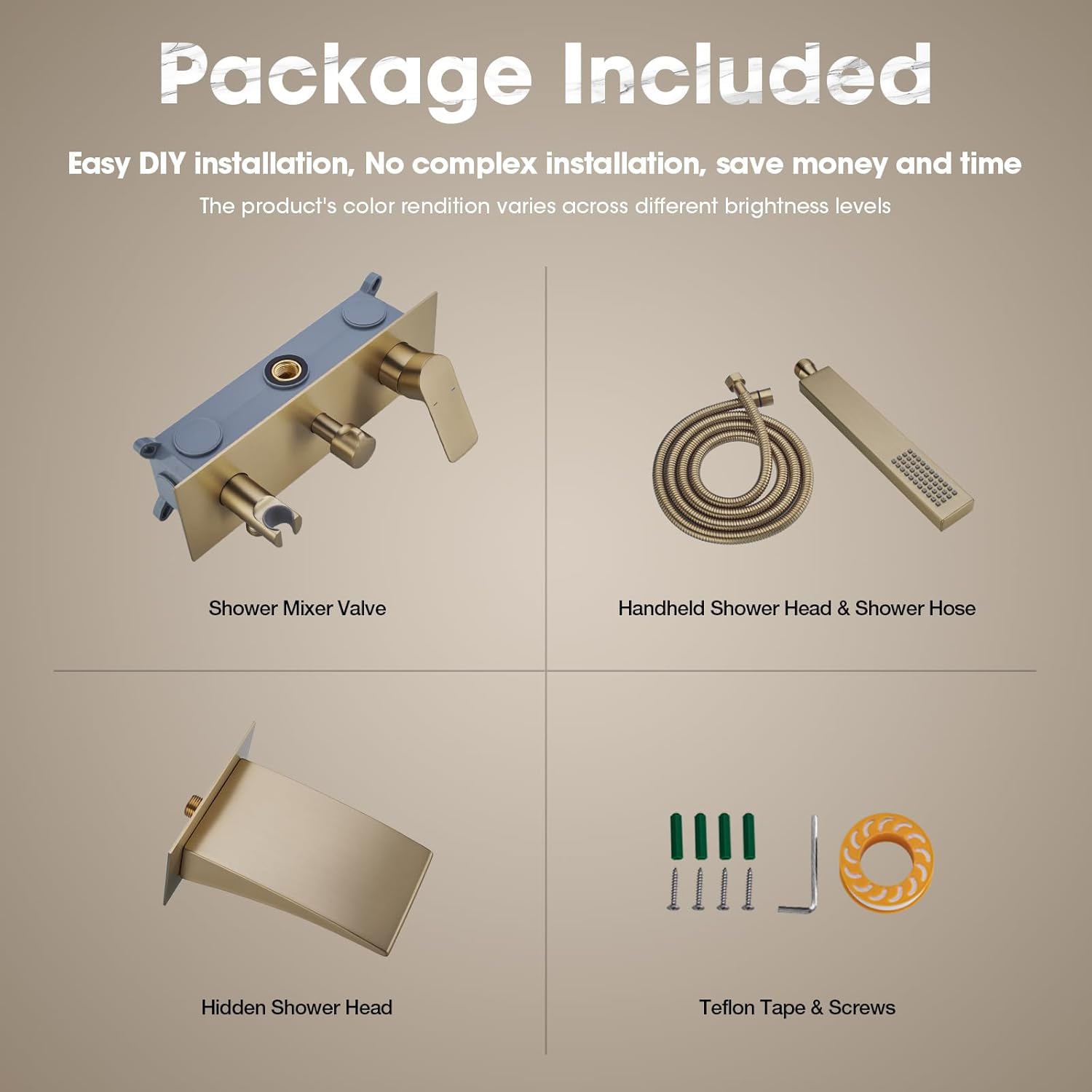 - Included ComponentsBrass Mixer Valve, handles, shower spout, shower holder, handheld shower, hose, Instructions