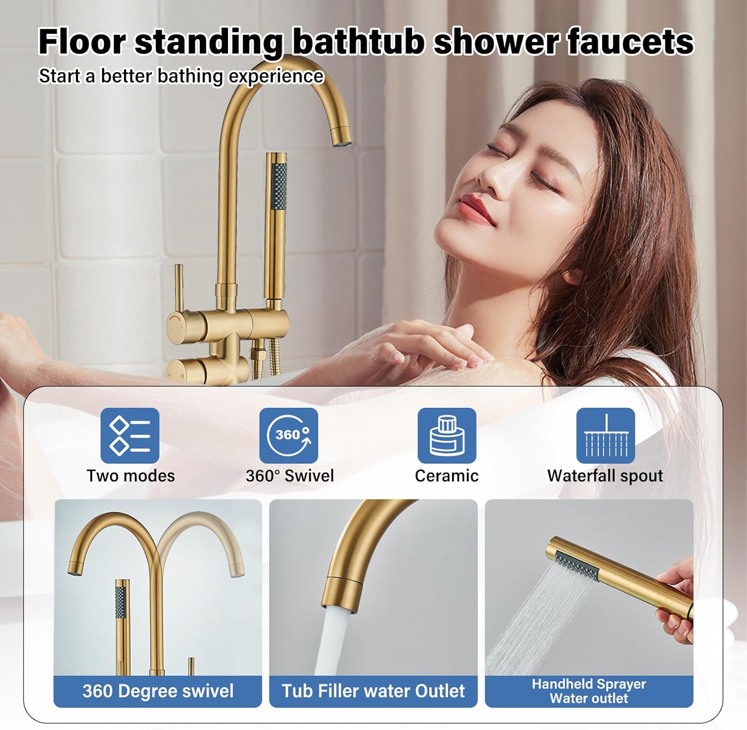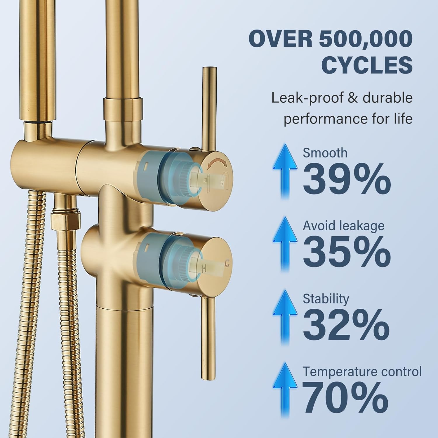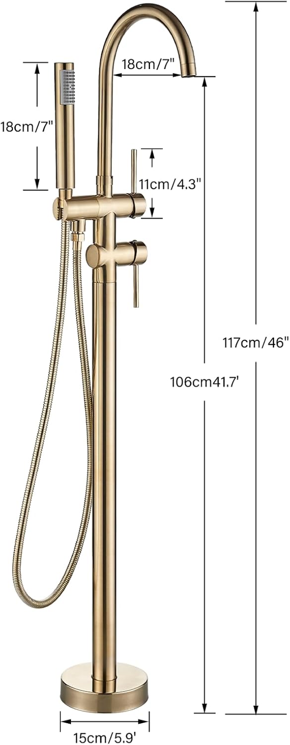 Bateria pentru cadă freestanding YAGATAP este realizată din alamă solidă de înaltă calitate. Finisajul brushed gold oferă un aspect modern și elegant în baie.