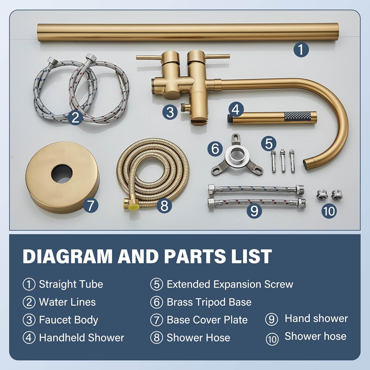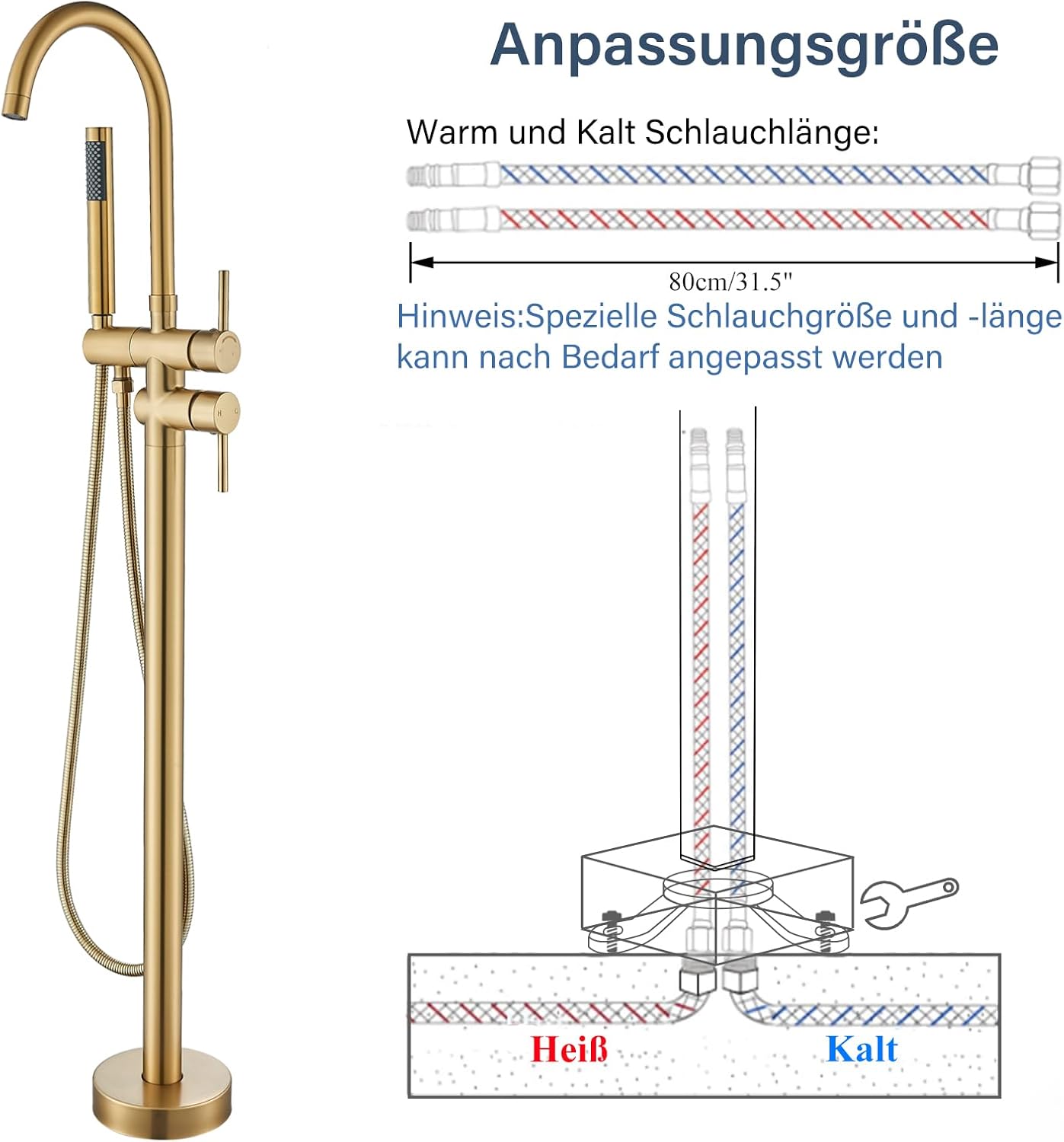 Setul include duș de mână din alamă cu furtun de 150cm și baterie cu înălțimea de 84cm. Designul este potrivit pentru montaj pe pardoseală lângă cadă.