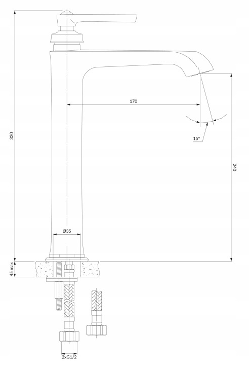 Modelul are o înălțime totală de 32 cm, o înălțime a jetului de apă de 24 cm și o lungime a pipei de 17 cm. Este prevăzut cu aerator cu tehnologie AIRWATER, iar tehnologia ECO WATER contribuie la reducerea consumului de apă cu aproximativ 50%. Debitul apei la presiunea de 3 bari este de 8,4 l/min, presiunea de lucru este între 1 și 6 bari, iar temperatura maximă pentru alimentarea cu apă caldă este de 90 °C. Bateria se încadrează în clasa de zgomot I, fiind silențioasă în utilizare.