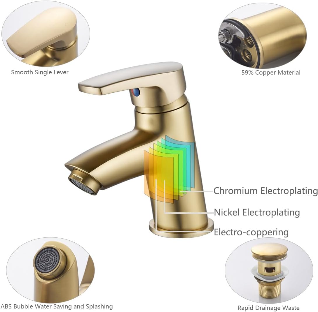Baterie monocomandă pentru lavoar cu finisaj auriu elegant. Realizată din alamă rezistentă. Include ventil pop up și racorduri G 1/2″. Compatibilă cu presiune minimă 0,5 bar și recomandată 1,0 bar. Ideală pentru băi moderne și clasice.