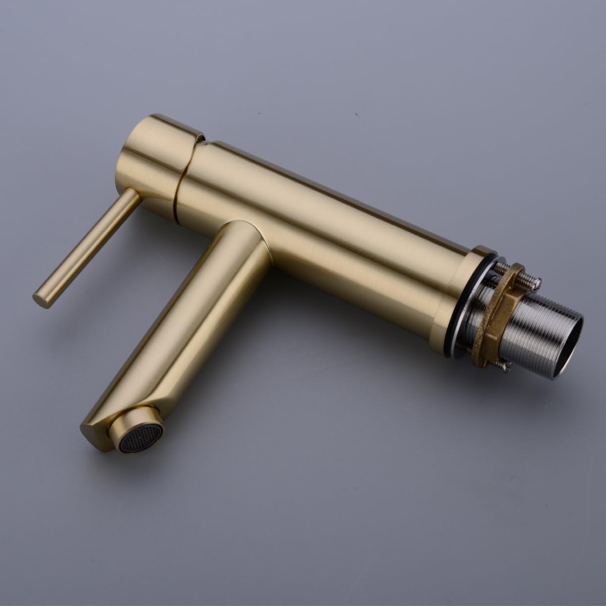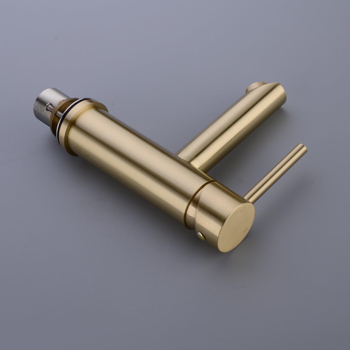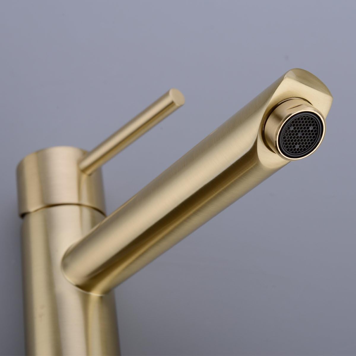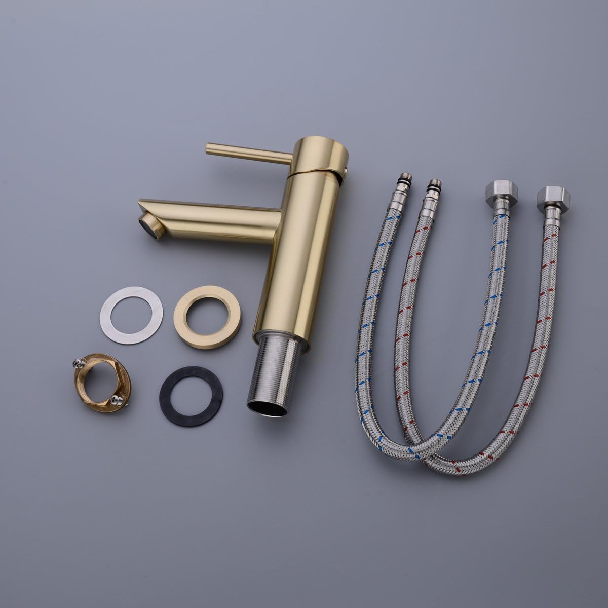 Baterie pentru lavoar cu funcție de amestec apă caldă și rece. Construcție din alamă solidă, finisaj auriu periat. Cartuș ceramic pentru funcționare lină și durabilă. Montaj pe blat, un singur orificiu, conexiune standard G1/2″. Include două furtunuri de alimentare de 60cm.