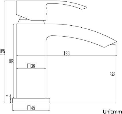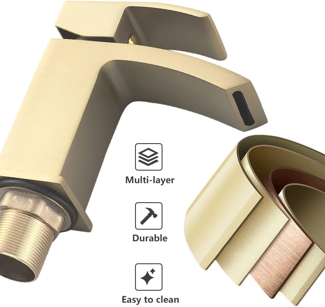 Baterie de lavoar Luckyhome cu jet tip cascadă și finisaj auriu periat. Alamă solidă, rezistentă la coroziune. Înălțime totală 120 mm. Greutate 765 g. Funcționează cu apă caldă și rece. Include ventil pop-up, furtunuri G 1/2″ și instrucțiuni de instalare.