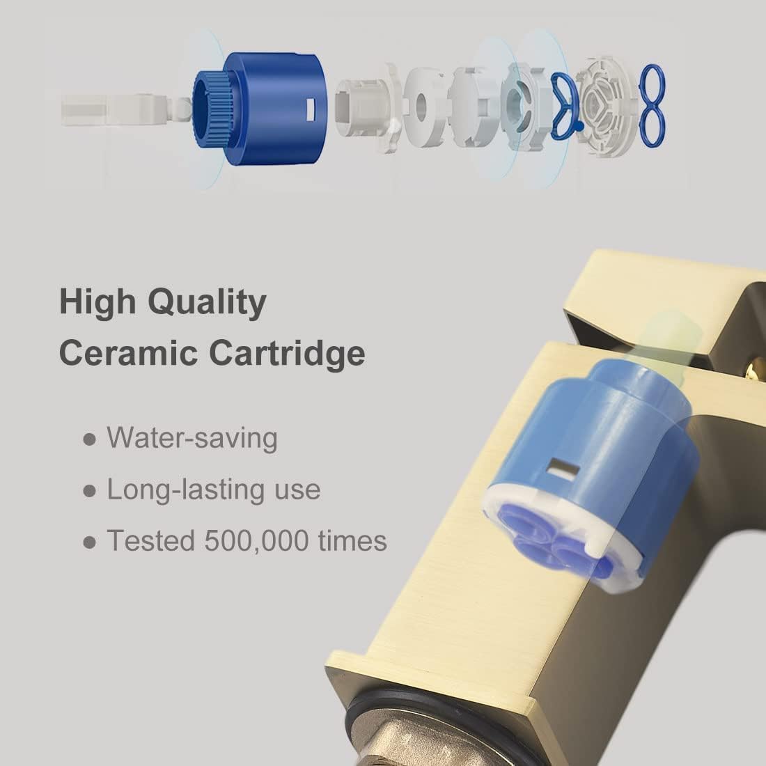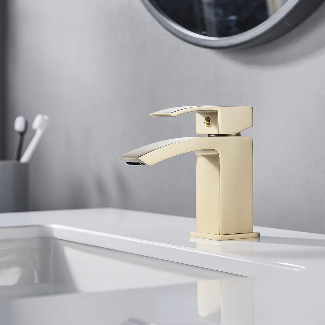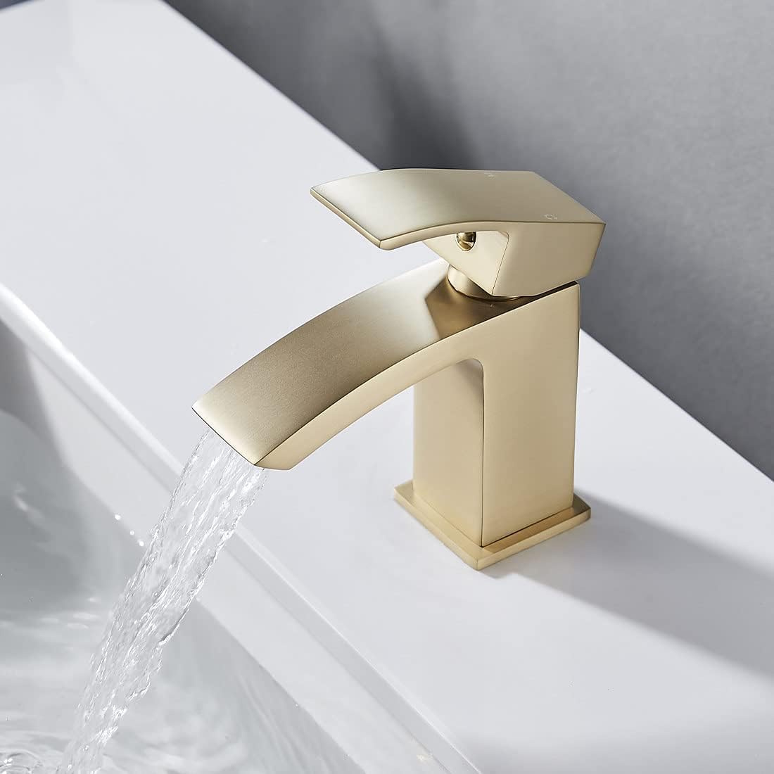 Bateria de lavoar Luckyhome oferă jet tip cascadă și design auriu periat. Creează un aspect modern și elegant în baie.