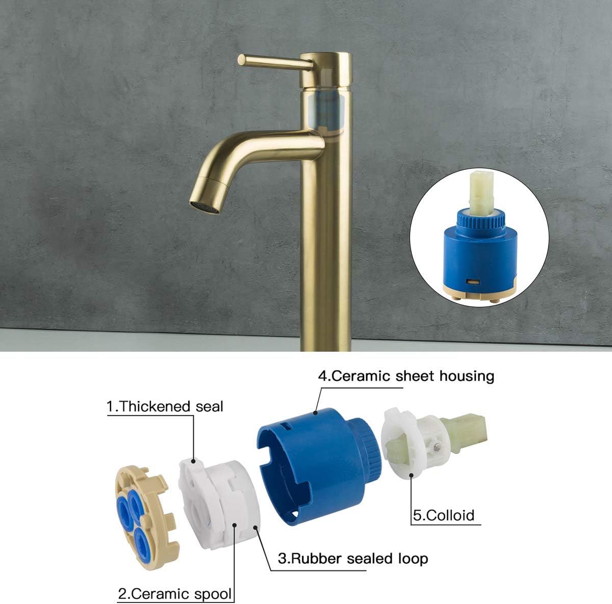 Baterie monobloc din alamă cu cartuș ceramic SEDAL pentru funcționare fără picurare. Jet moale, fără stropire. Finisaj brushed gold rezistent la coroziune și zgârieturi. Furtunuri standard 1/2” (≈ 1,3 cm) cu împletitură inox și tub interior PEX, sigure pentru apa potabilă.