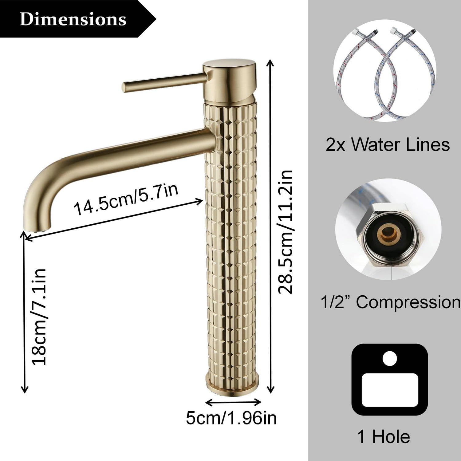 Bateria cu un singur orificiu este potrivită pentru lavoare de baie, RV-uri și băi comerciale. În pachet sunt incluse furtunurile de alimentare cu apă standard UK și racordul din alamă.