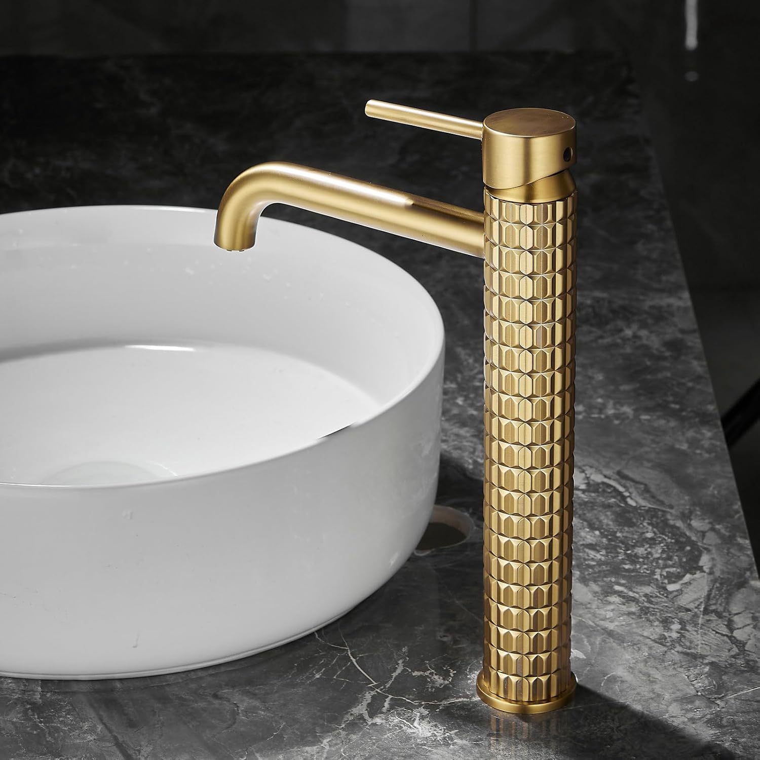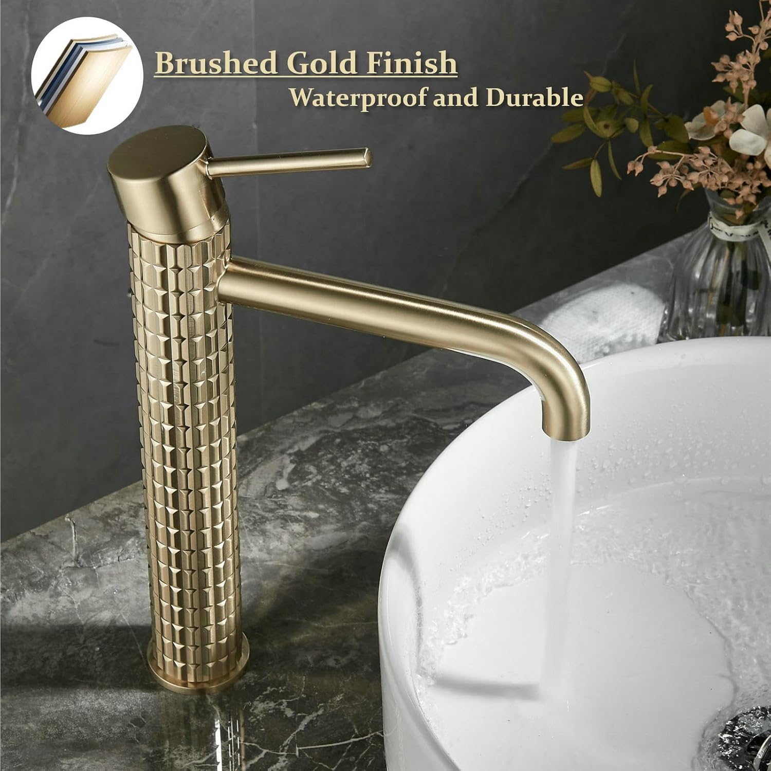 Baterie pentru lavoar SHUNLI din alamă solidă, rezistentă la rugină și coroziune. Finisaj brushed gold elegant, fără amprente. Cartuș ceramic durabil, testat până la 500.000 de cicluri. Potrivită pentru lavoare de baie, RV-uri și băi comerciale.