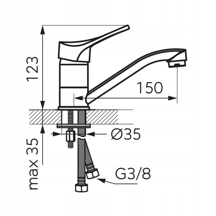 Bateria are o înălțime totală de 12 cm și o adâncime a pipei de 17 cm. Este echipată cu cartuș ceramic de 35 mm și perlator standard cu funcție de economisire a apei. Debitului îi corespunde valoarea de 12 l/min, iar în pachet este inclus un furtun de alimentare de 35 cm. Produsul nu include ventil și nu are dop.