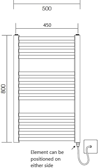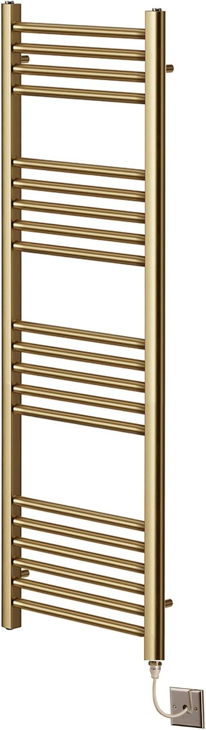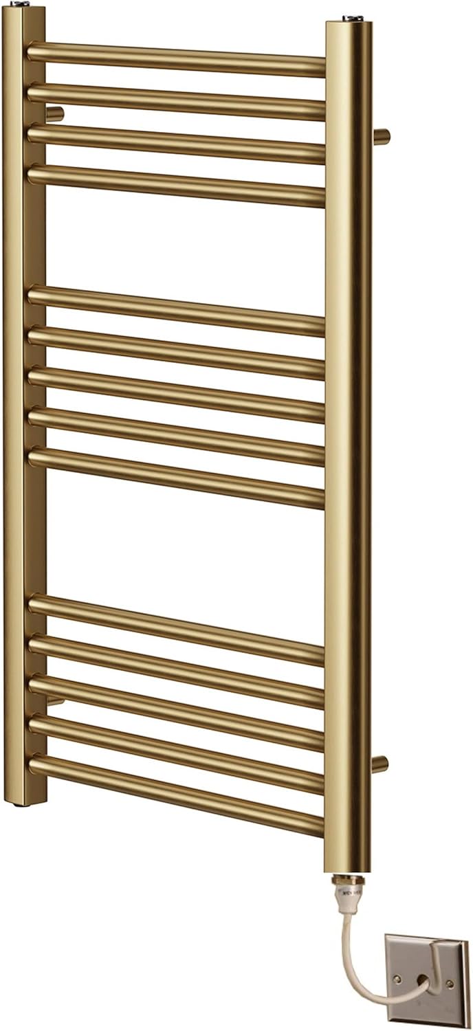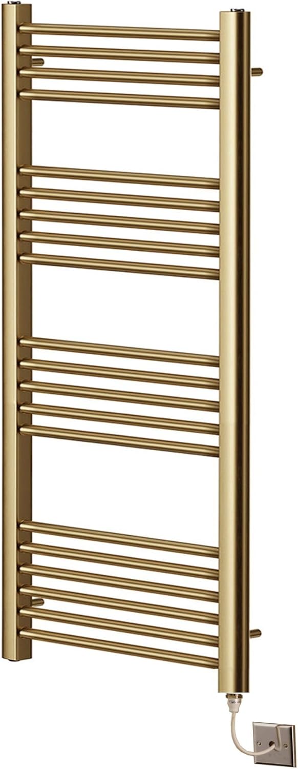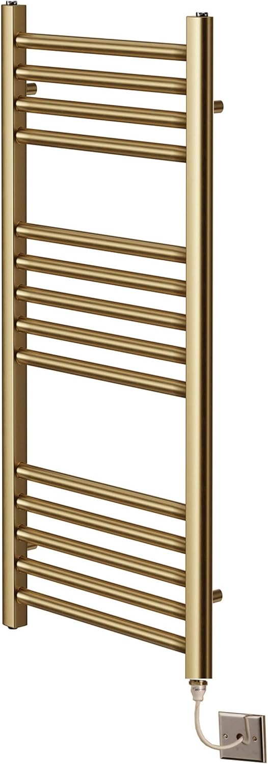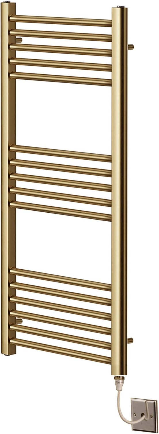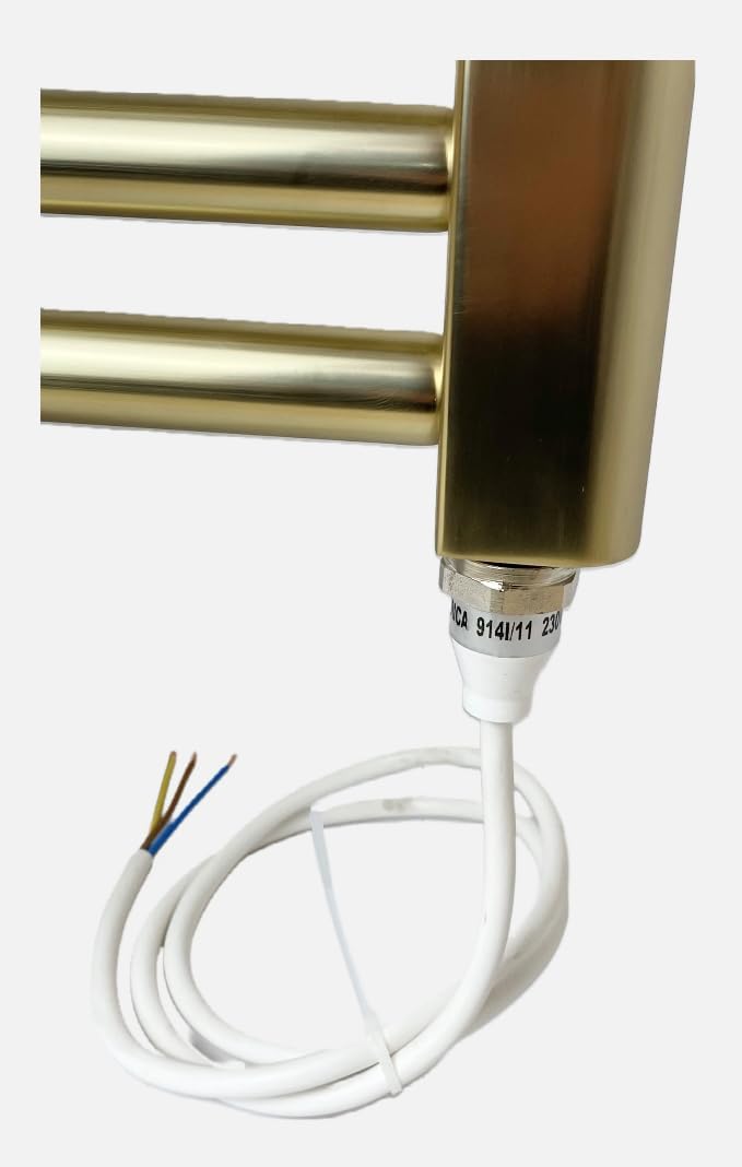 Calorifer electric pentru prosoape din alamă periată, 500mm x 800mm. Element PTC eficient, fără termostat necesar. Bare multiple pentru căldură ridicată și uscarea rapidă a prosoapelor. Suporturi reglabile pentru montaj ușor și spațiu optim de agățare.