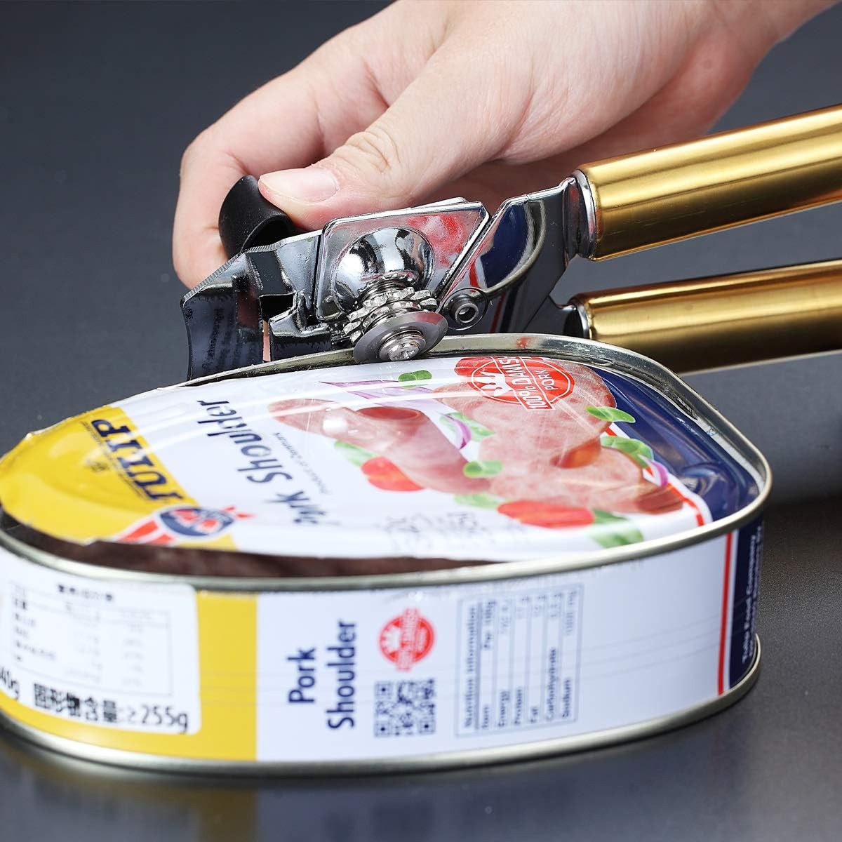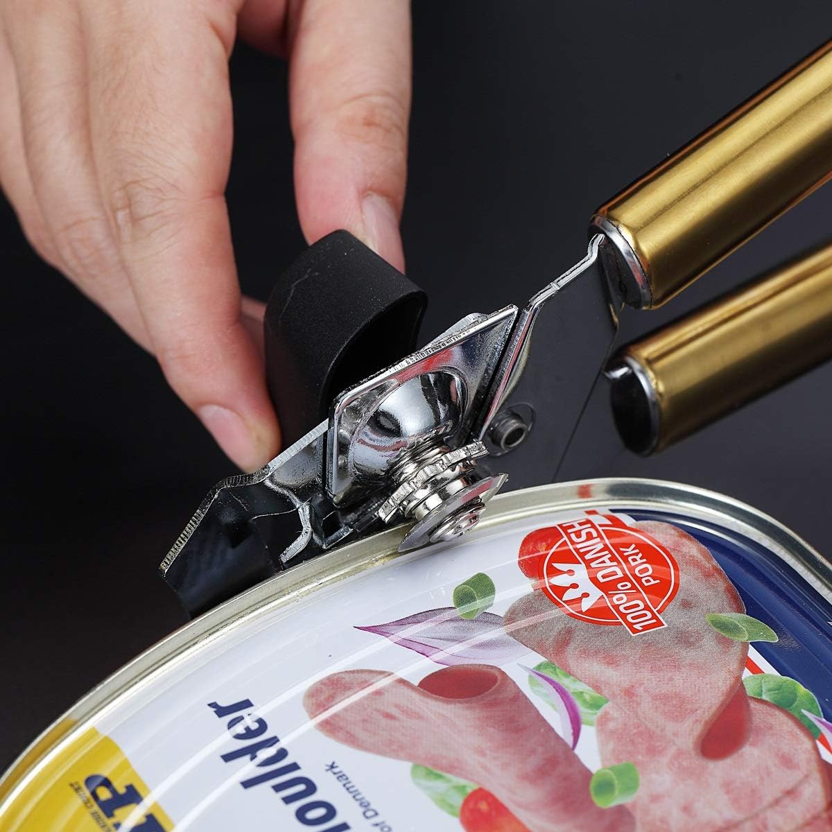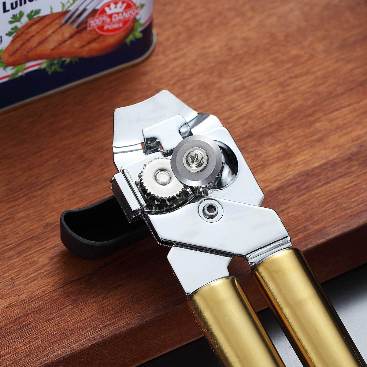 Deschizător de conserve Berglander din oțel inoxidabil, fără plumb. Mâner auriu cu placare de titan, aspect elegant. Mecanism manual robust, heavy duty, pentru margini netede și utilizare zilnică confortabilă în bucătărie.
