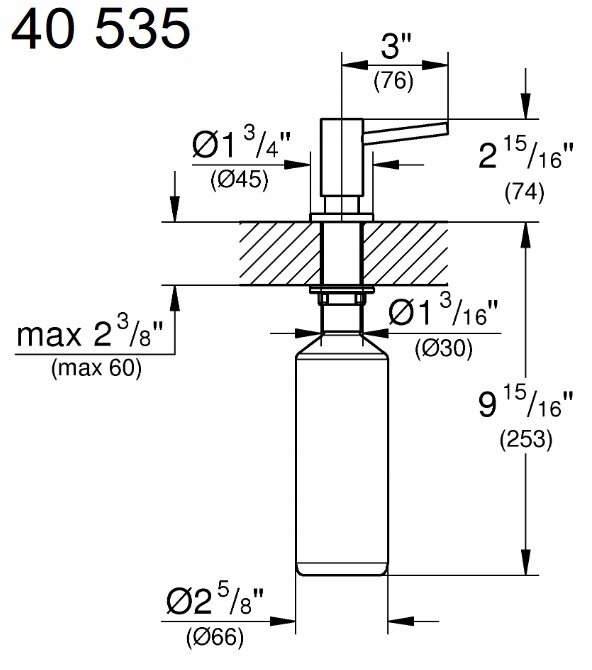 Modelul are o capacitate de 500 ml, suficientă pentru folosire curentă, iar montajul necesită un orificiu cu diametrul de 30 mm. Dimensiunile produsului sunt de 7,4 cm în înălțime, 6,6 cm în lățime și 6,6 cm în adâncime, ceea ce îl face ușor de integrat pe blat.