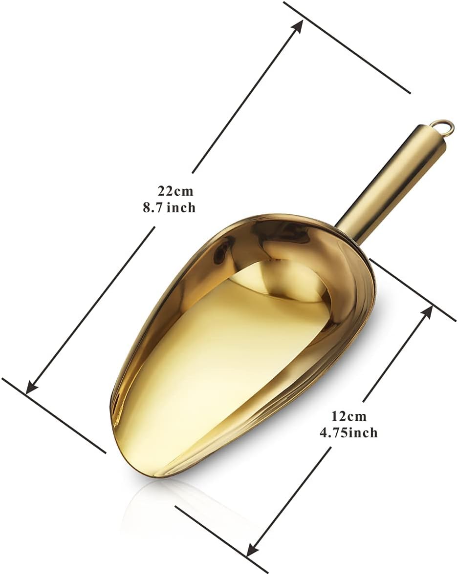 Lingură pentru gheață Berglander din oțel inoxidabil, 6 OZ (≈ 170 g). Plating titan auriu cu finisaj oglindă. Ideală pentru gheață, bomboane, nuci, cereale și hrană pentru animale. Design ergonomic, rezistentă la rugină, ușor de curățat și depozitat.