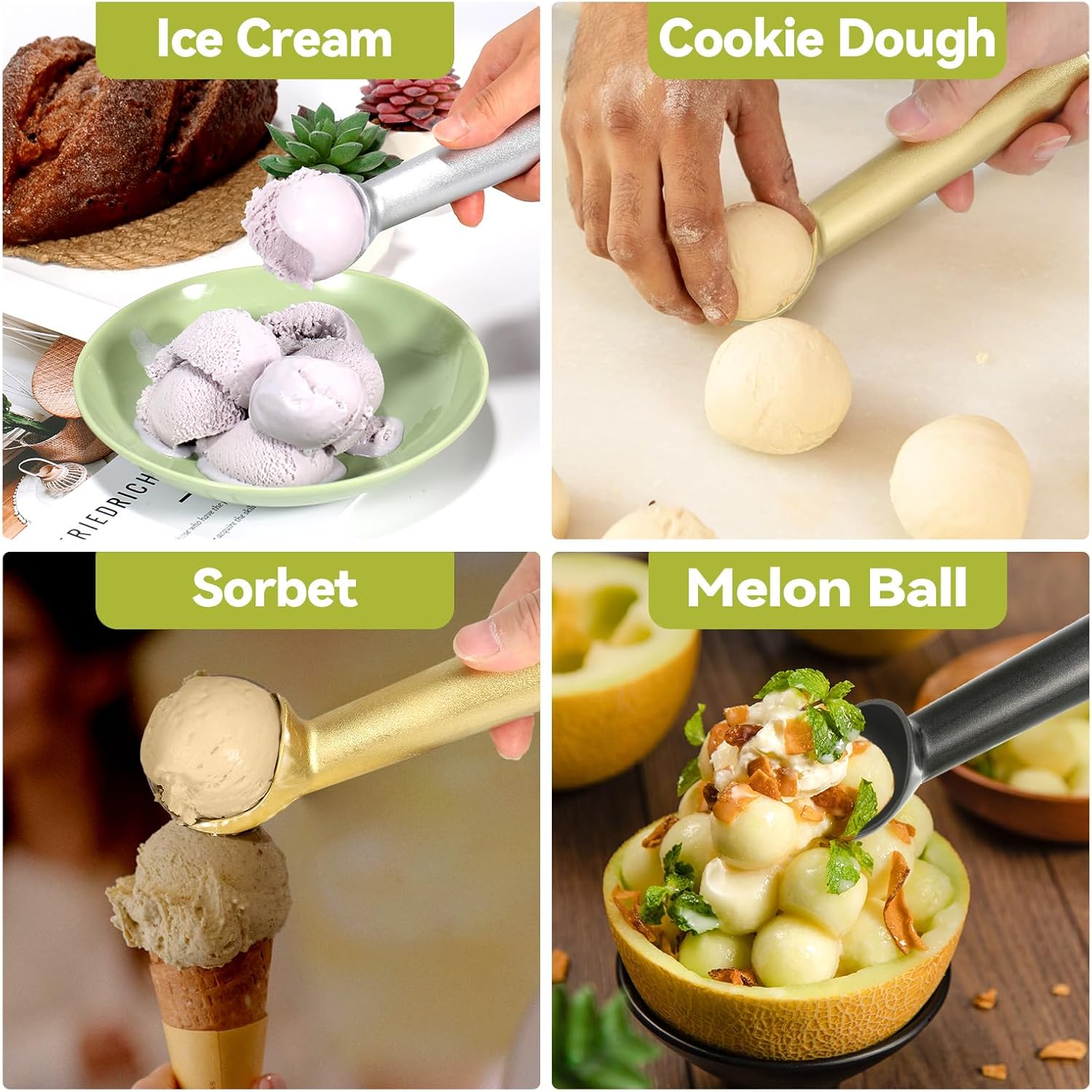 Mânerul ergonomic oferă prindere confortabilă. Ajută la formarea de bile rotunde de înghețată, chiar și din înghețată tare sau iaurt înghețat.