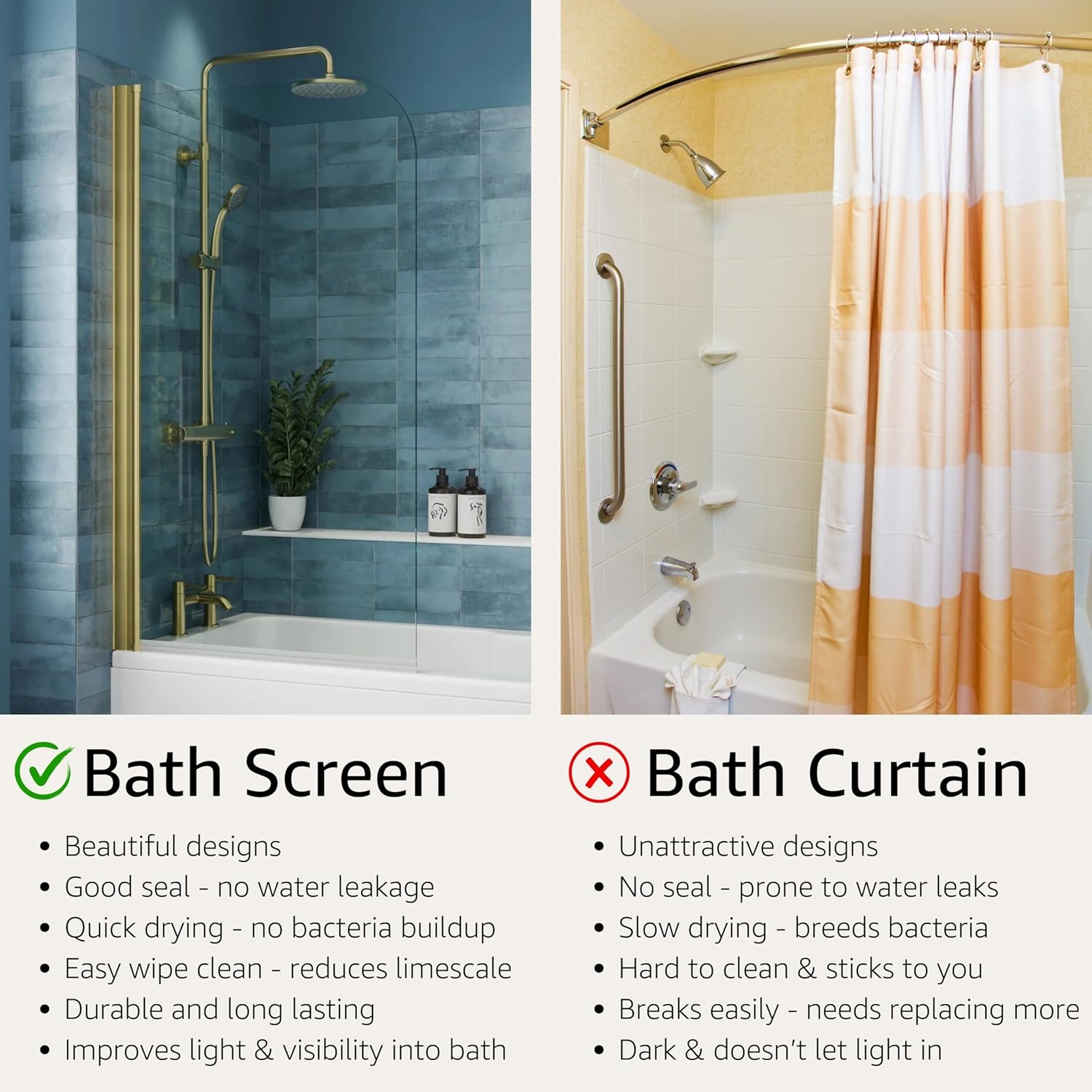 Sticla de siguranță călită de 6mm este robustă și sigură. Profilul de perete din alamă periată este reglabil și asigură o fixare sigură pe perete.