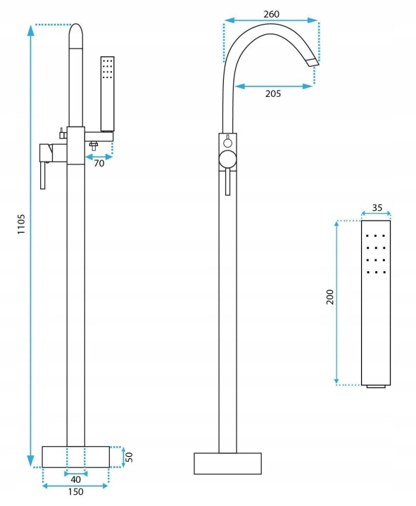 Produsul este prevăzut cu pipă mobilă, are o lungime de proiecție a pipei de 205 mm și o înălțime totală de 1105 mm. Diametrul racordului este de 19 mm, iar montajul se realizează la nivelul pardoselii.
