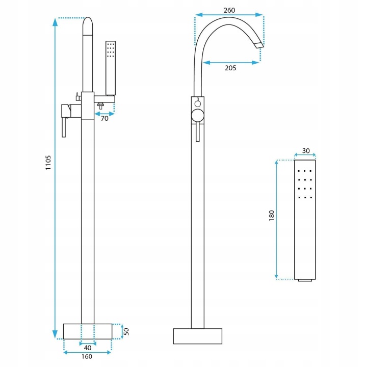 Produsul este destinat utilizării la cadă și este prevăzut cu pipă mobilă, cu o lungime de 205 mm. Bateria are o înălțime de 1105 mm, iar diametrul racordului este de 19 mm, fiind realizată pentru montaj direct în pardoseală.