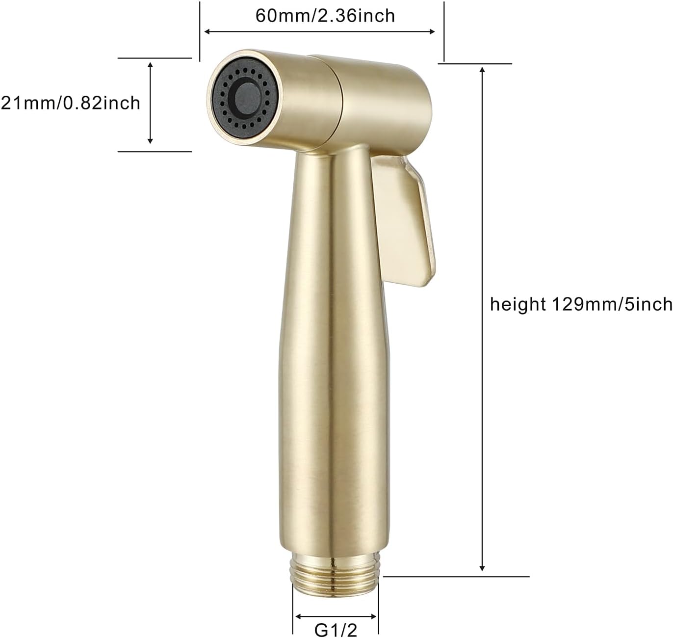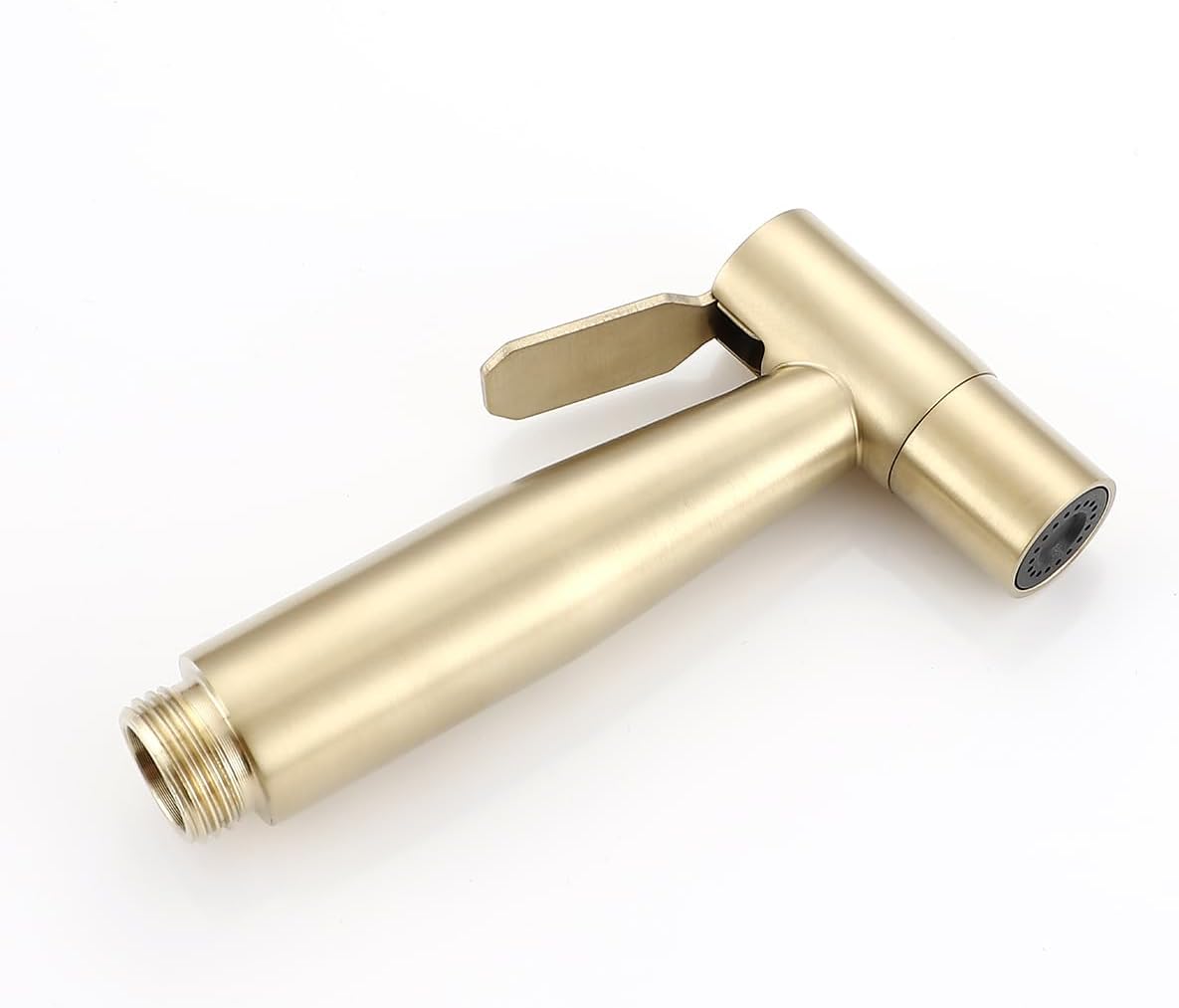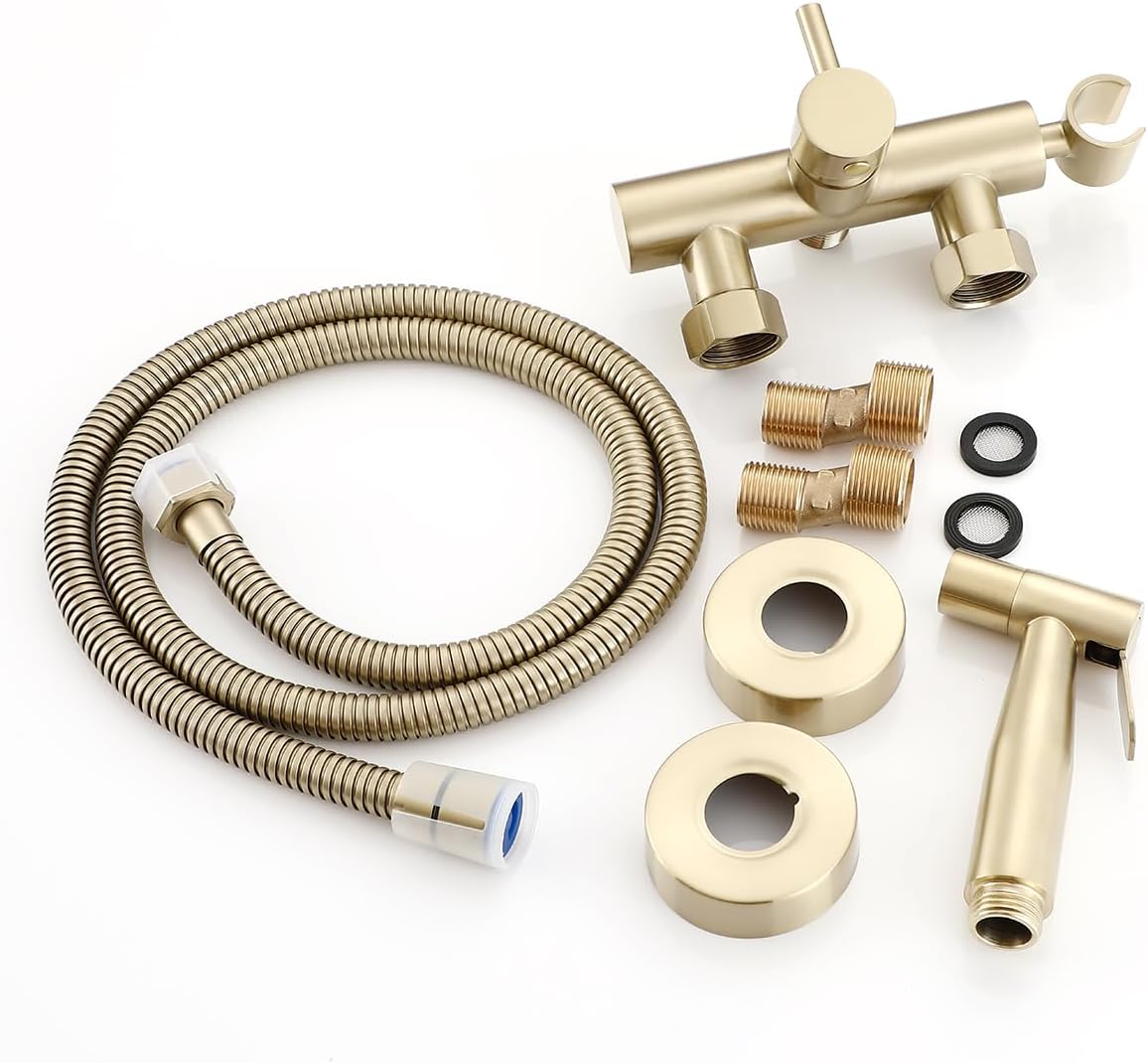 Set modern de duș tip Shattaf pentru toaletă, cu montaj în perete. Alamă și oțel inoxidabil, finisaj Brushed Gold. Include baterie cu amestec apă caldă și rece, cap de pulverizare, suport de perete și furtun de 1,2 m. Potrivit ca bideu sau duș igienic zilnic.