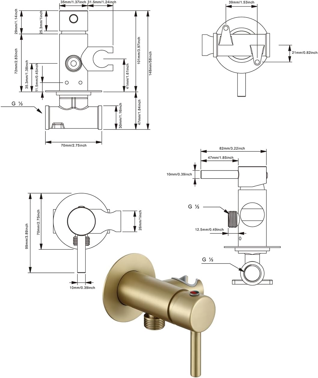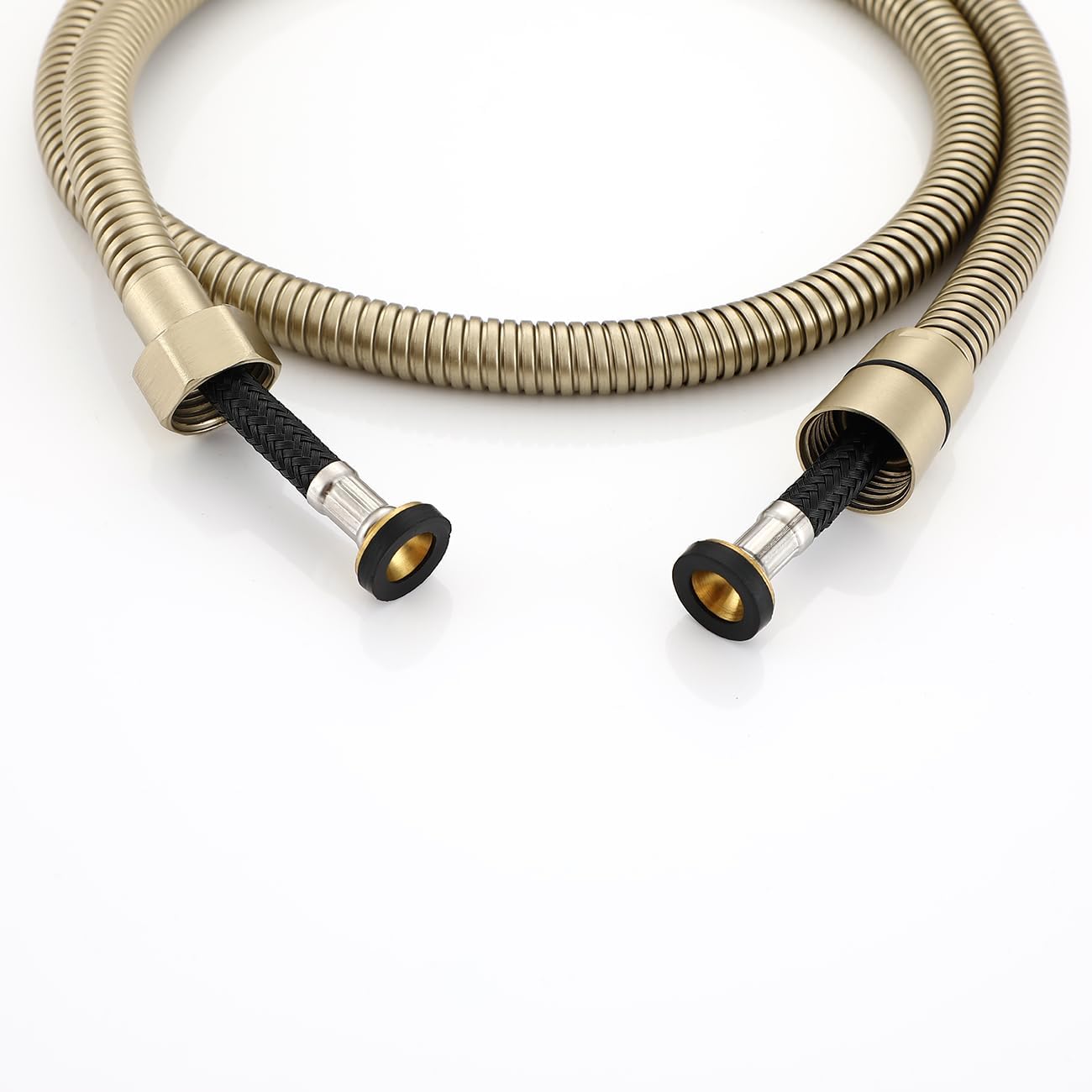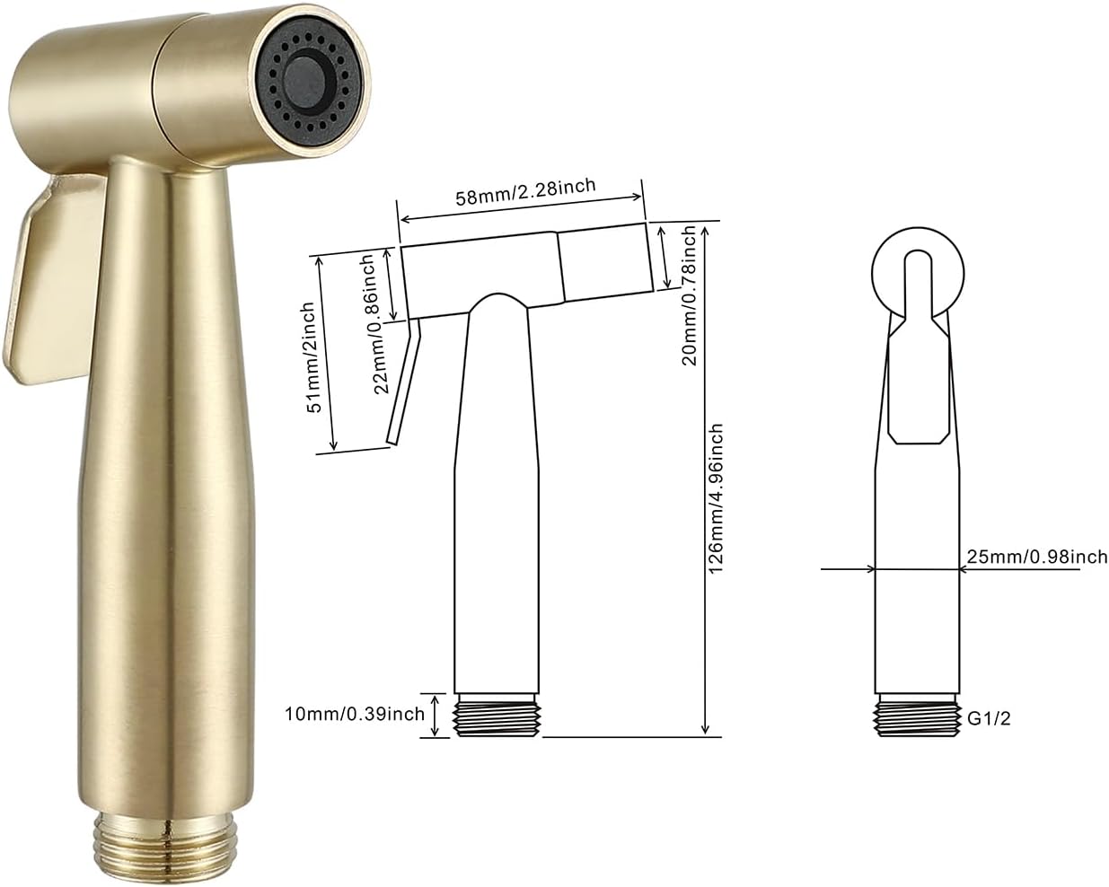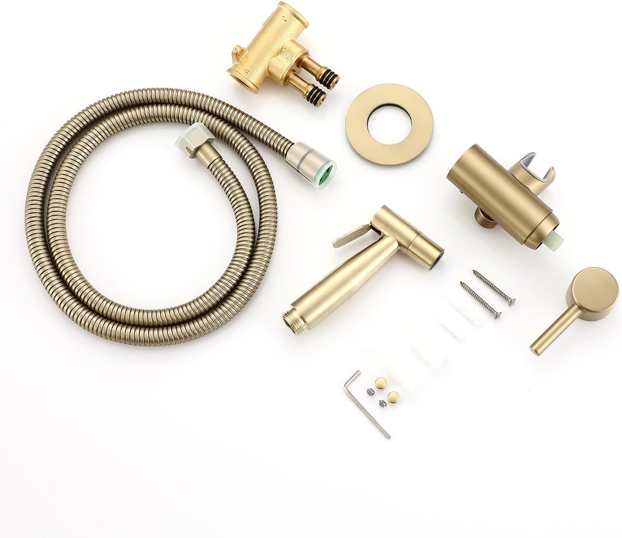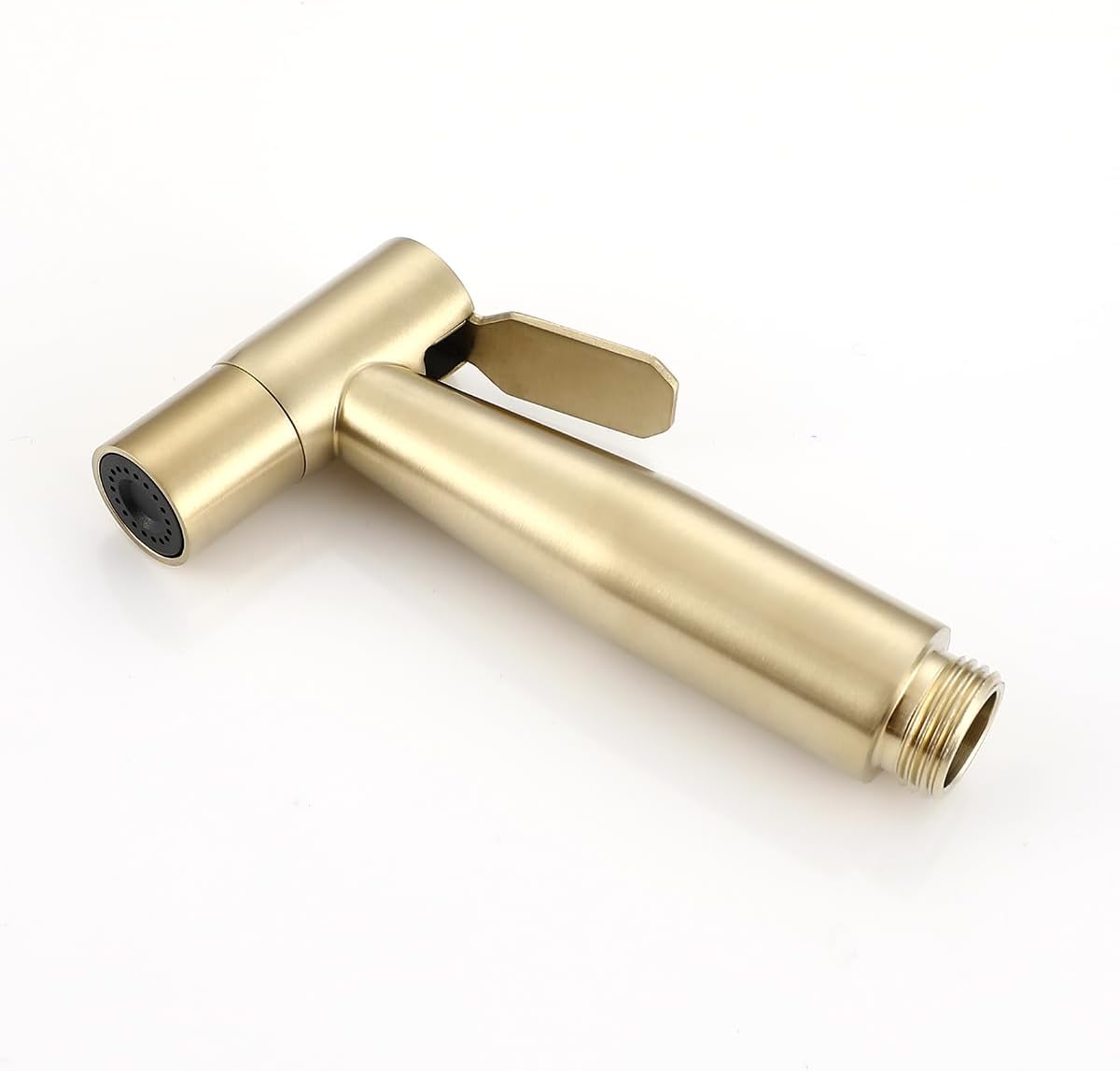Set duș igienic tip bideu cu montaj în perete, finisaj brushed gold. Corp din alamă și pulverizator din oțel inoxidabil 304. Include furtun de 1,2 m, baterie bideu G1/2 și suport. Recomandat pentru igienă intimă, duș musulman și îngrijire ginecologică.