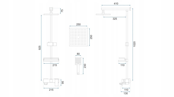 Pachetul conține bateria, furtunul de duș cu para de duș și pălăria de duș. Bateria este monocomandă, iar înălțimea ansamblului este de 105 cm. Pălăria de duș are diametrul de 25 cm, oferă jet tip ploaie, iar furtunul are lungimea de 150 cm. Setul este prevăzut cu racord pentru duș de 1/2", pipă mobilă și pară de duș cu mâner profilat.