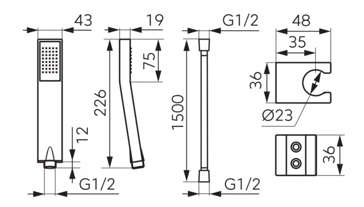 Produsul include o pară de duș cu o singură funcție, cu jet tip ploaie, și un furtun de duș din PVC cu lungimea de 1500 mm. Lungimea perei de duș este de 226 mm.