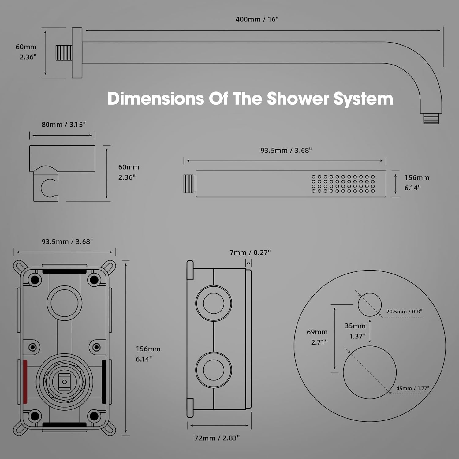 Baterie de duș încastrată cu cartuș ceramic de 35 mm și plăci de 135 mm și 185 mm, grosime 3 mm, cu funcție 2-way spray power.
