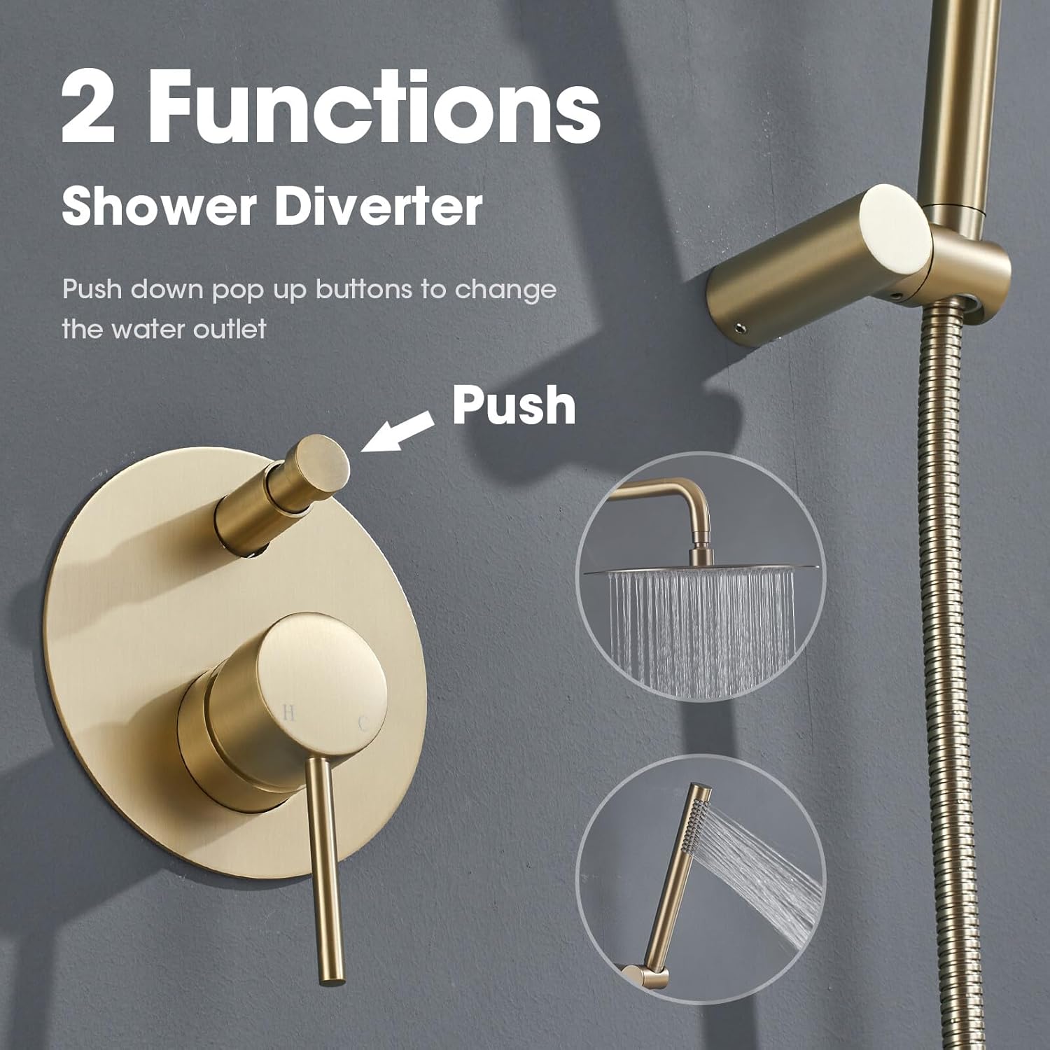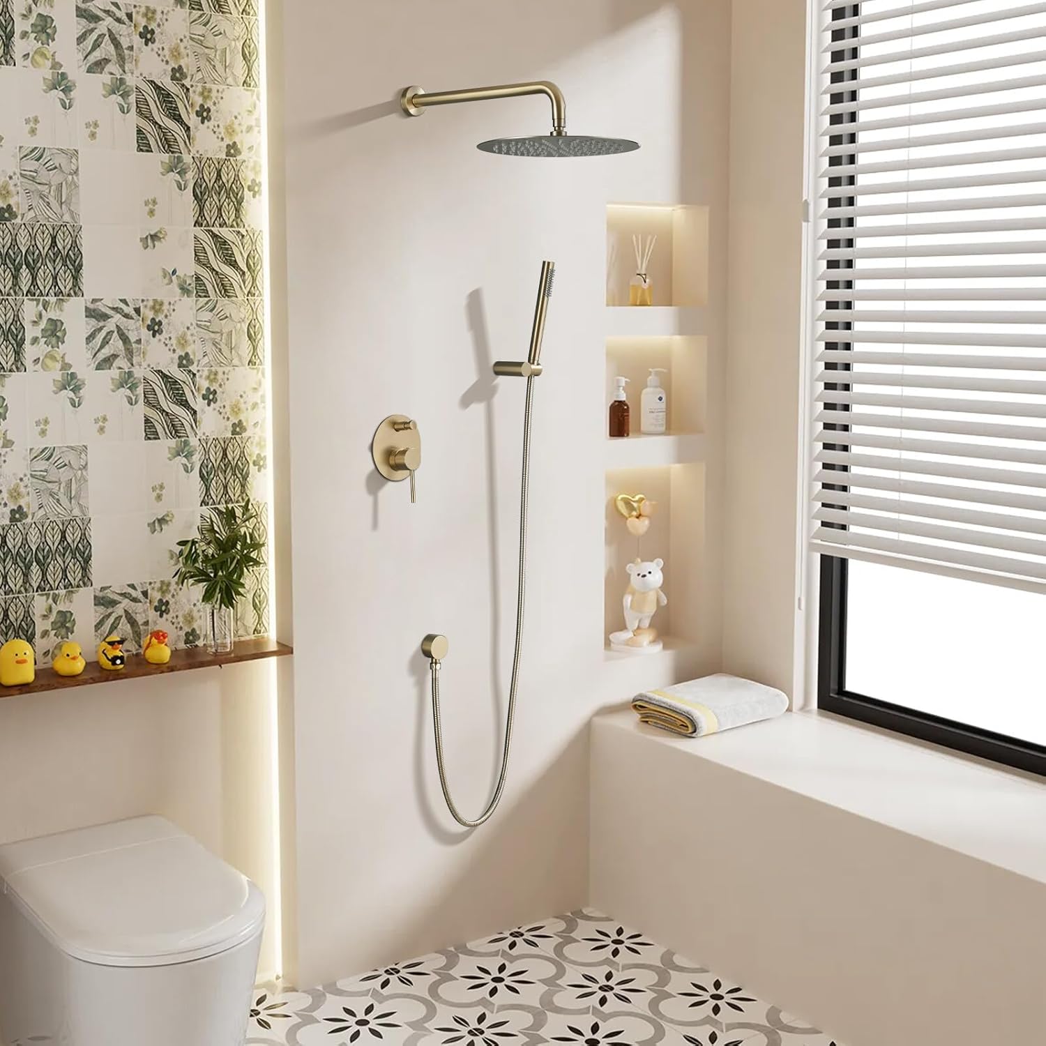 Sistem de duș fix montat pe perete, realizat din alamă solidă cu finisaj brushed gold elegant.