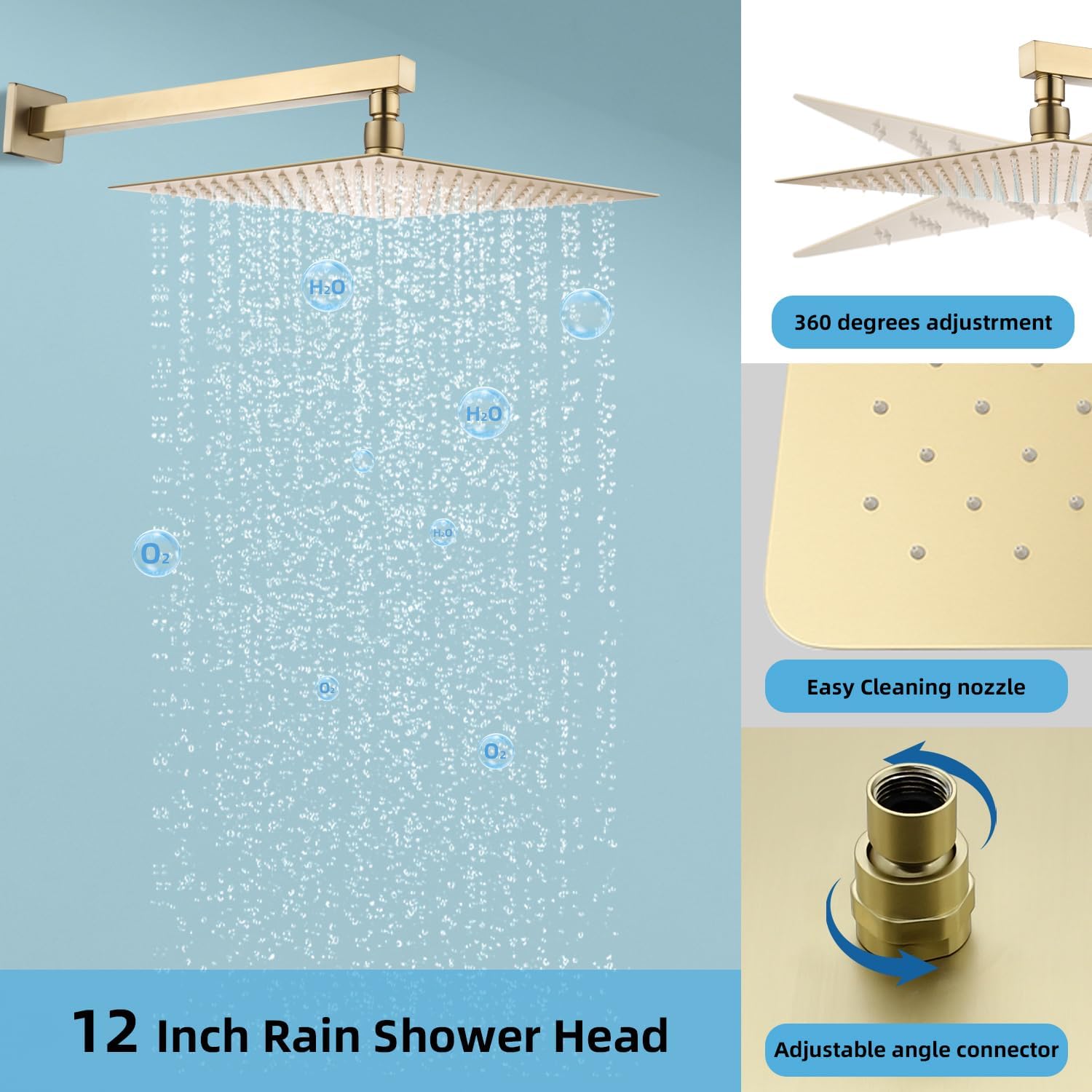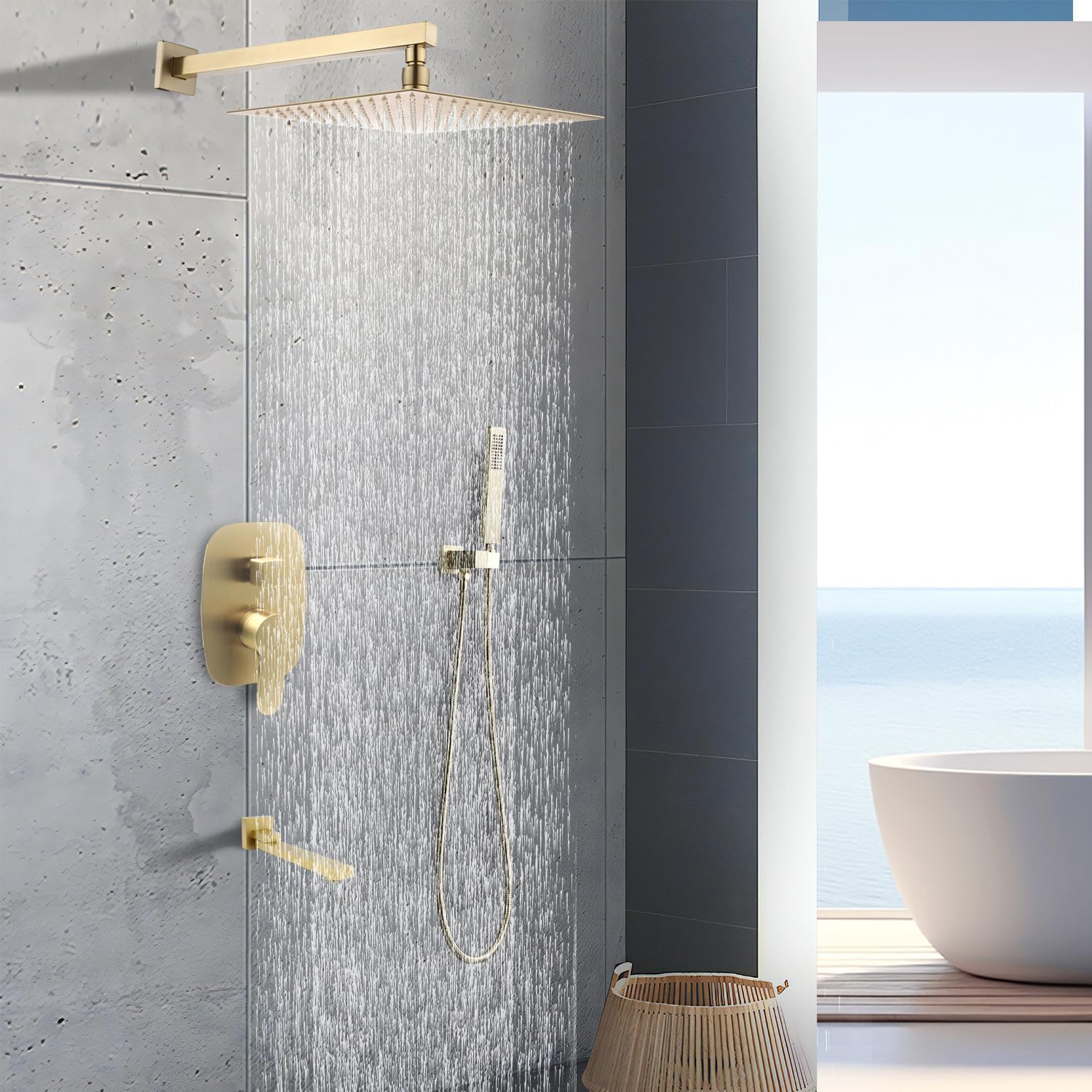 Set de duș îngropat din metal, finisaj brushed gold. Trei funcții: duș ploaie, duș de mână și baterie cadă. Mixerul cu 3 căi oferă control precis al temperaturii și debitului. Design modern și durabil pentru baie.
