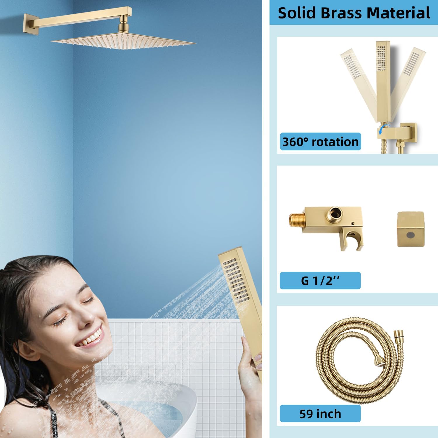 Setul de duș este complet metalic, cu finisaj brushed gold elegant. Oferă rezistență ridicată și aspect modern în baie.