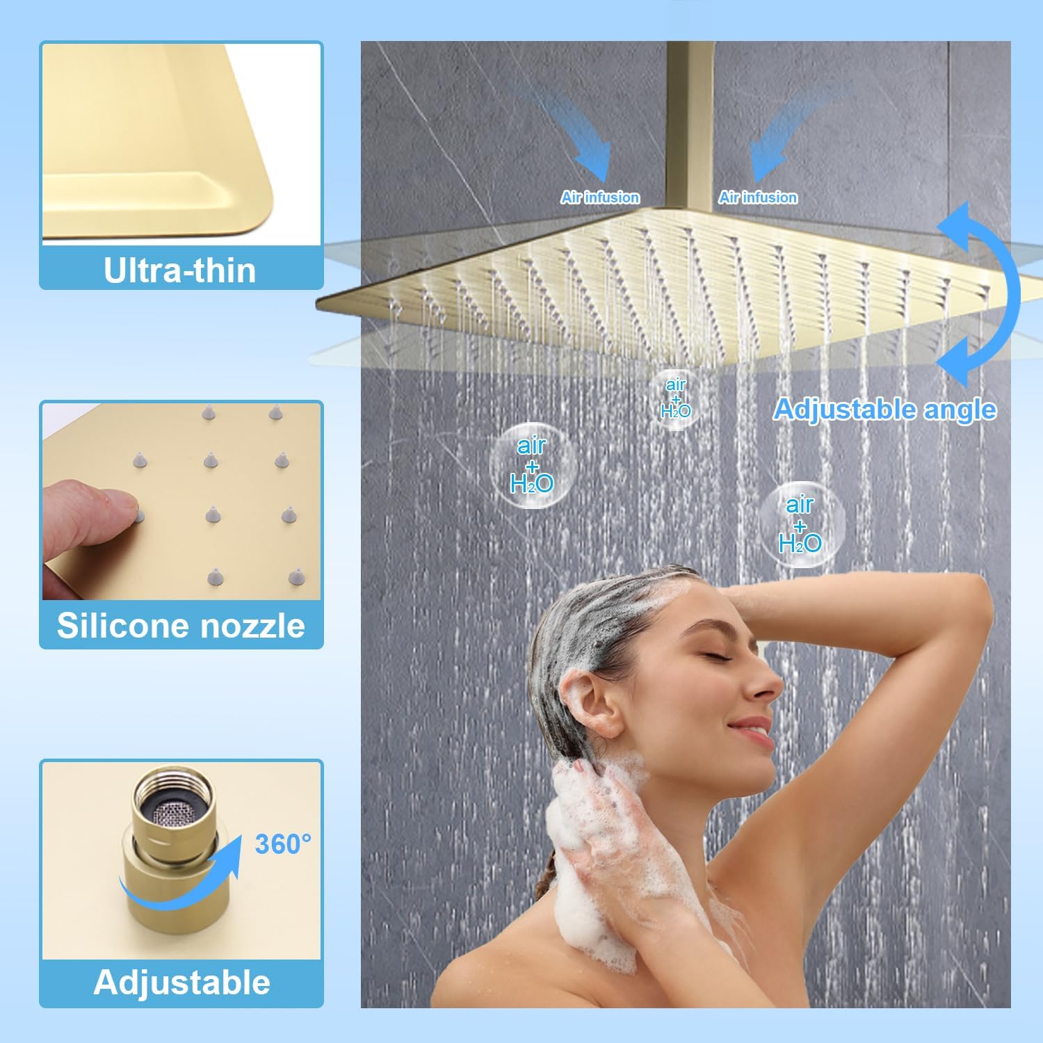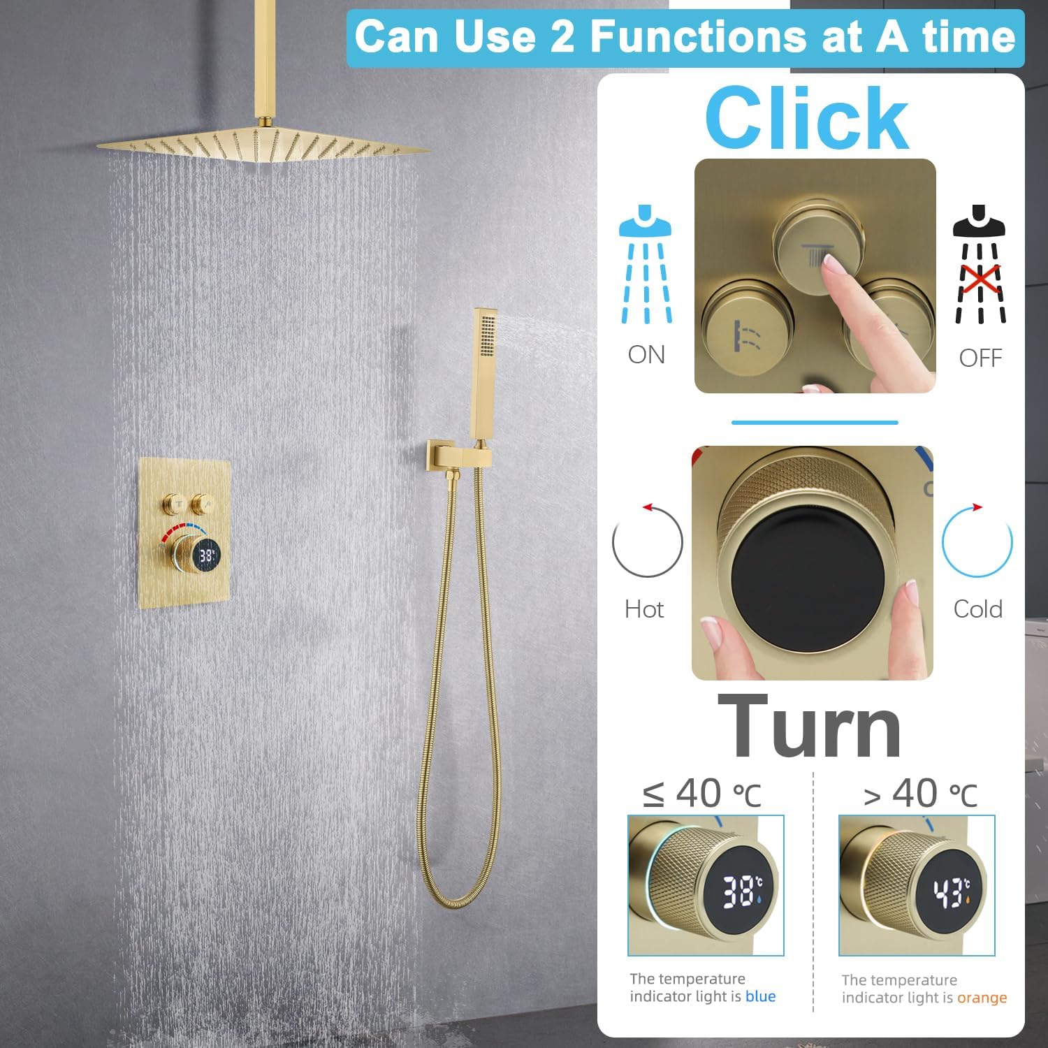 Set de duș tavan cu cap tip ploaie de 16 inch (≈ 40,6 cm) și duș de mână. Funcții utilizabile simultan. Baterie încastrată cu afișaj LED alimentat de apă. Control precis al temperaturii. Construcție din alamă și oțel inoxidabil, ușor de întreținut.