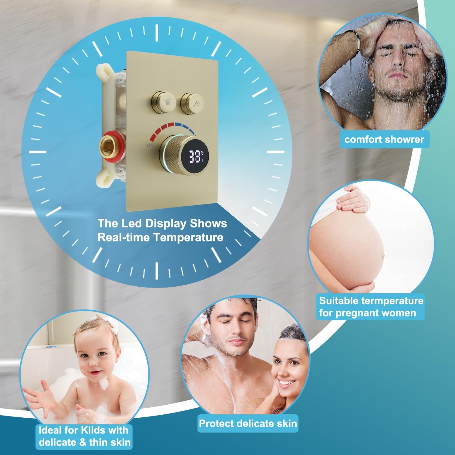 Bateria încastrată are afișaj digital LED alimentat de fluxul de apă. Vezi în timp real temperatura apei și o reglezi precis cu butonul de pe baterie.