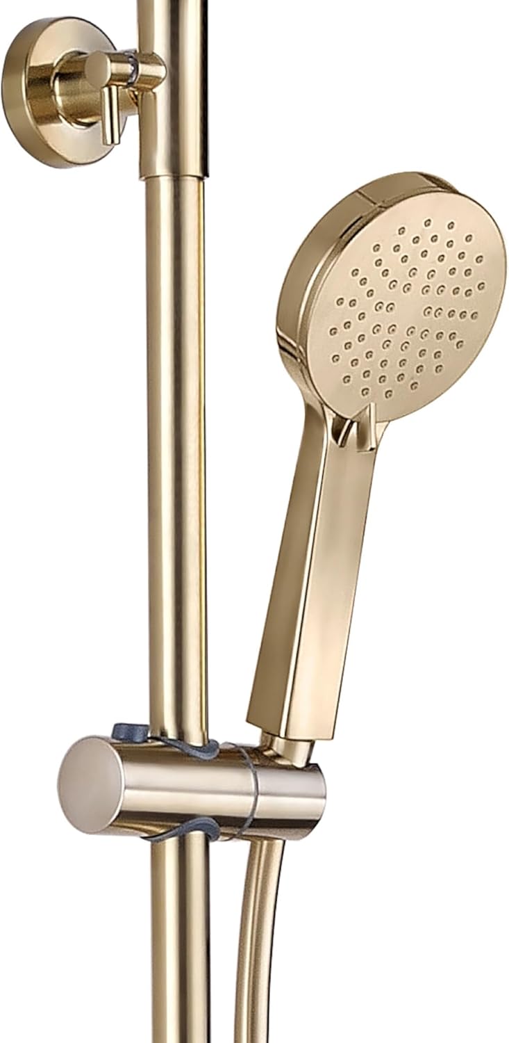 Dispozitivul anti-opărire integrat cu funcție de override menține temperatura constantă. Finisajul Brushed Brass este ușor de întreținut, cu duze din cauciuc ușor de curățat pe capetele de duș.