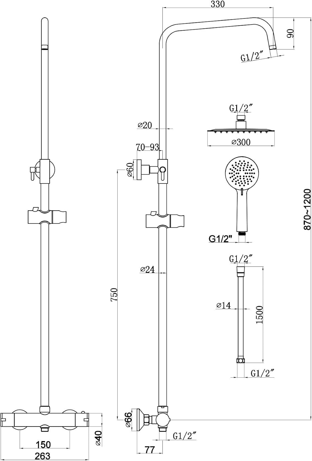 - Set bară de duș termostatică cu două ieșiri și capete de duș rotunde
