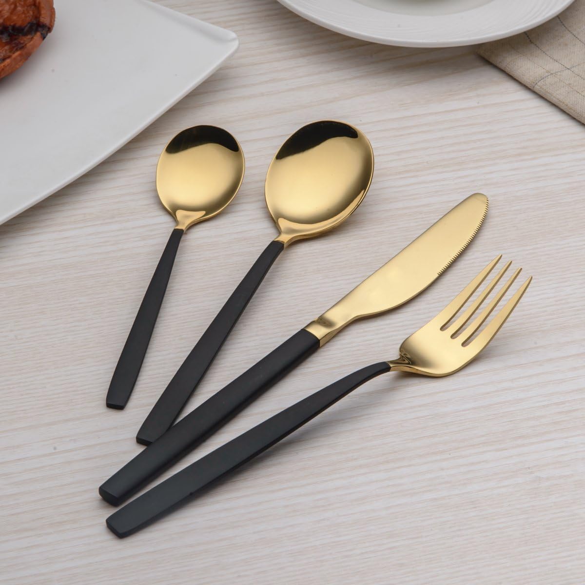 Set tacâmuri Berglander din oțel inoxidabil 18/0, 24 piese, pentru 6 persoane. Design elegant, Black cu accente aurii. Plăcuțe în mână, bine echilibrate. Suprafață dură, rezistentă la zgârieturi. Potrivite pentru uz zilnic și ocazii speciale. Compatibile cu mașina de spălat vase.