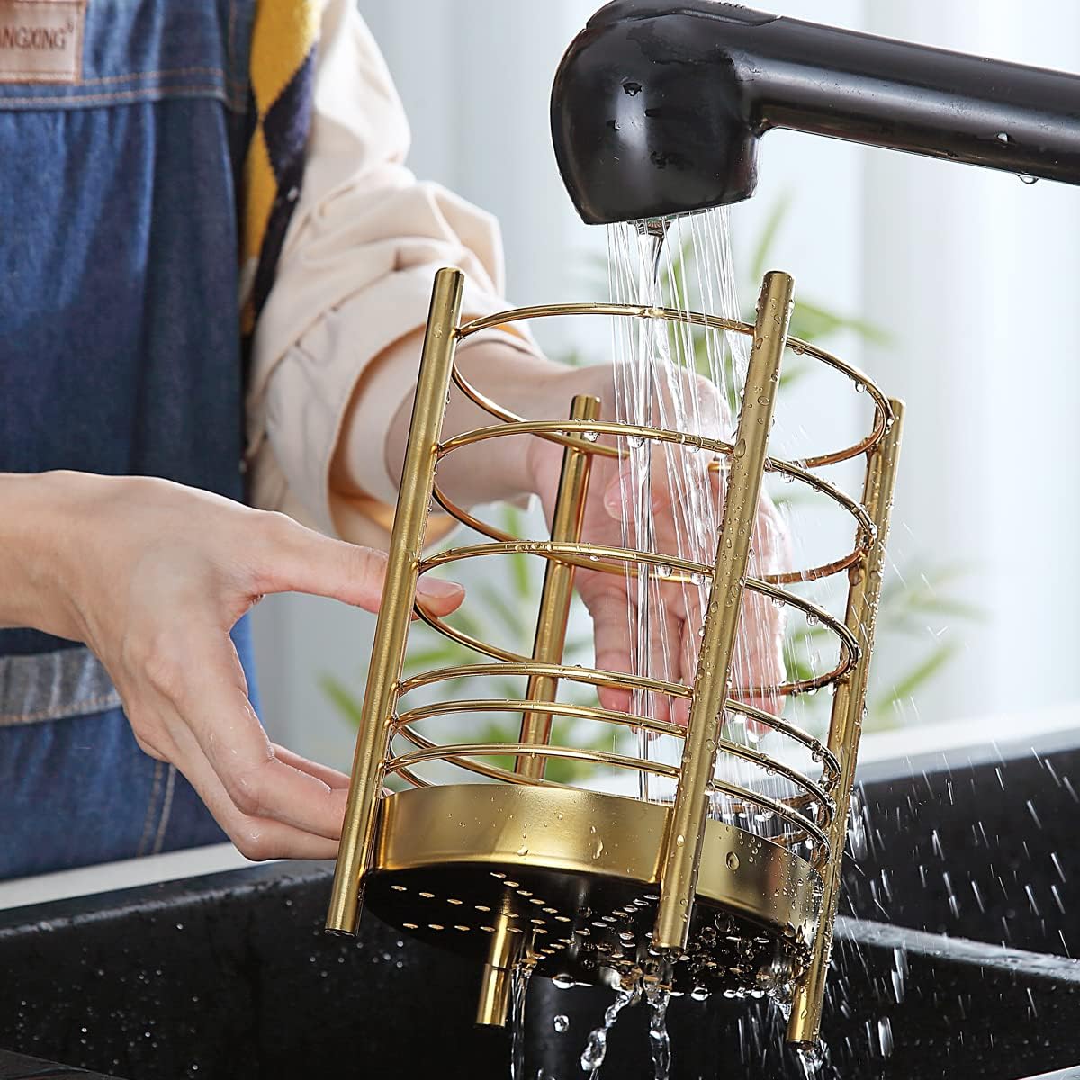 Suportul pentru ustensile din oțel inoxidabil este stabil, durabil și ușor de curățat. Are orificii de drenaj în partea de jos pentru evacuarea apei și a prafului. Toate piesele sunt ușor de întreținut și compatibile cu mașina de spălat vase.