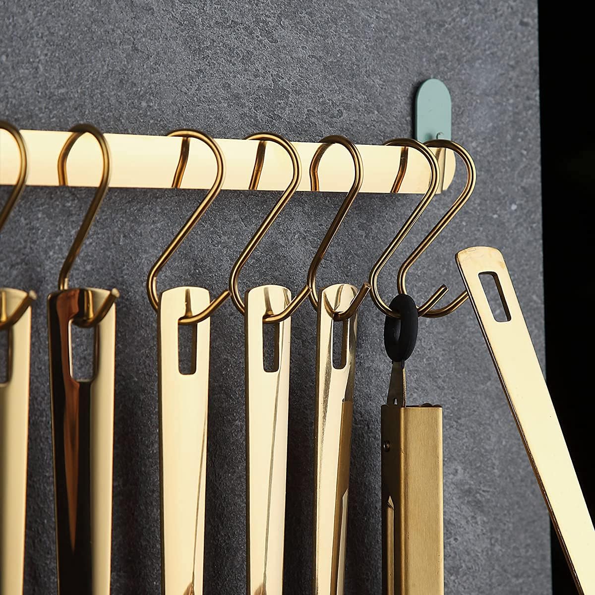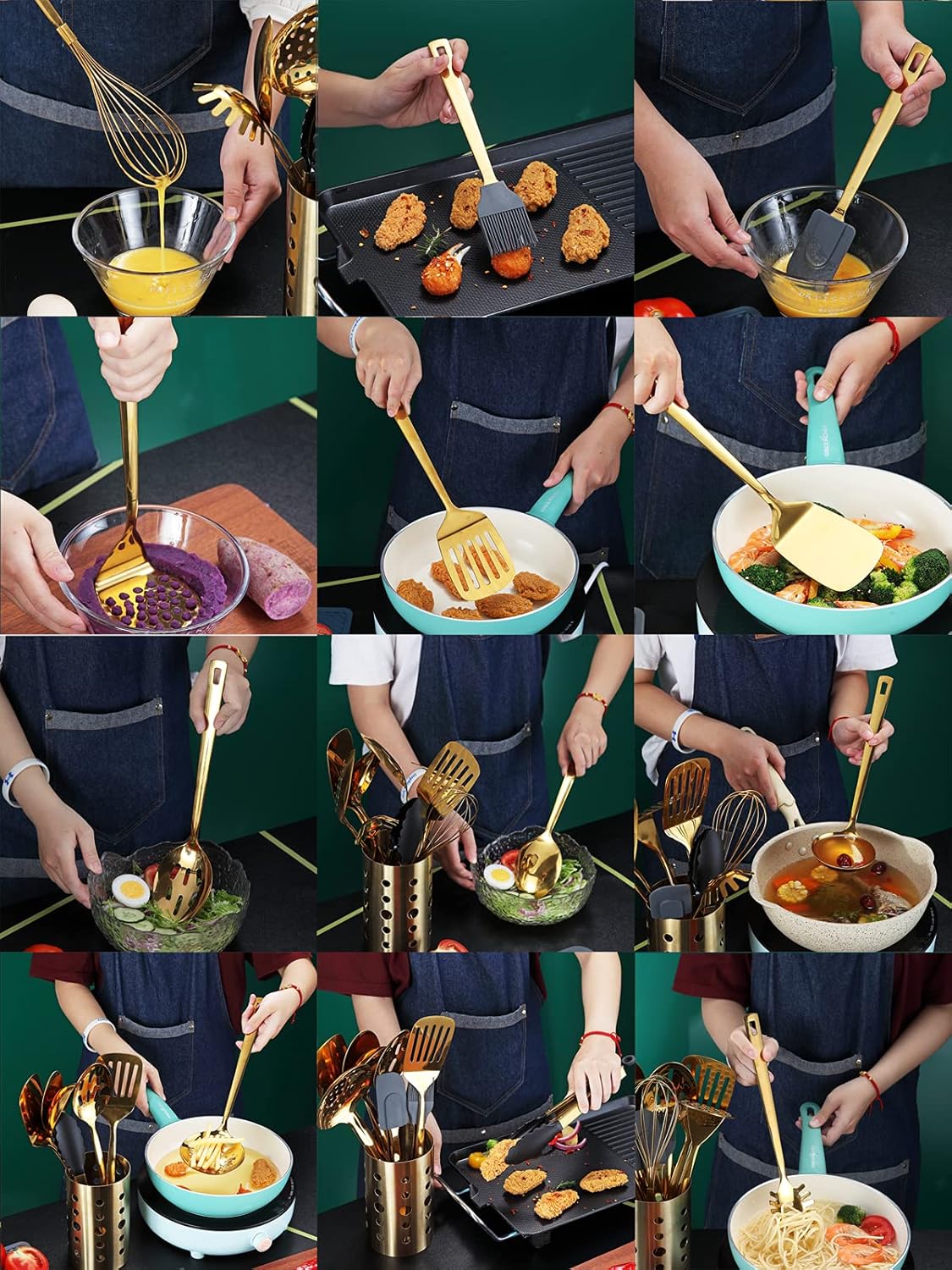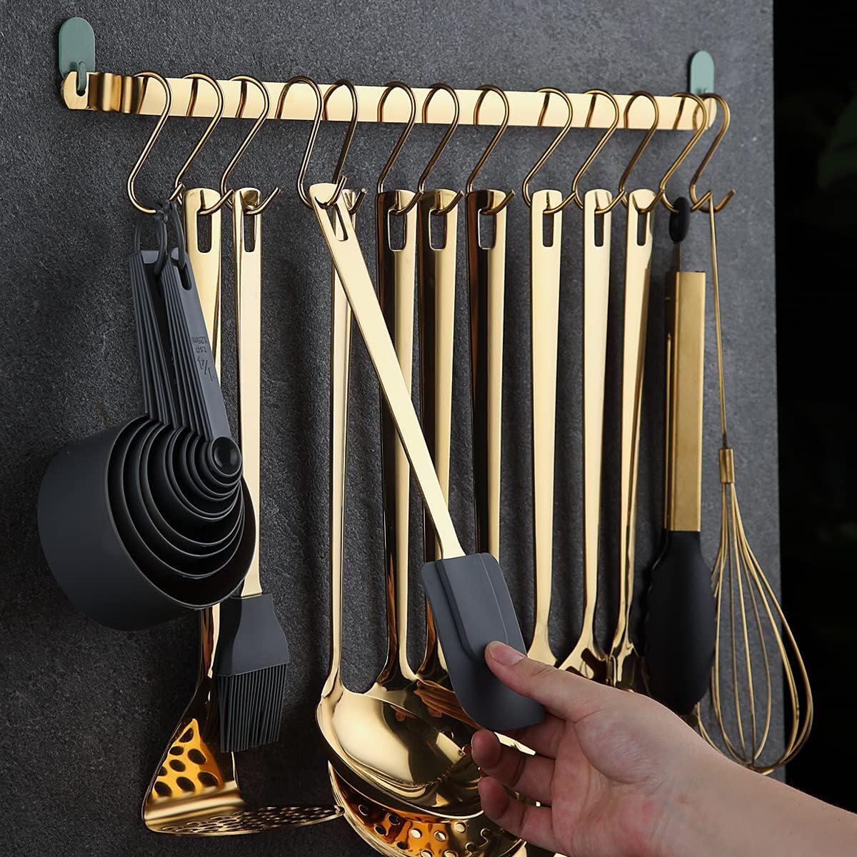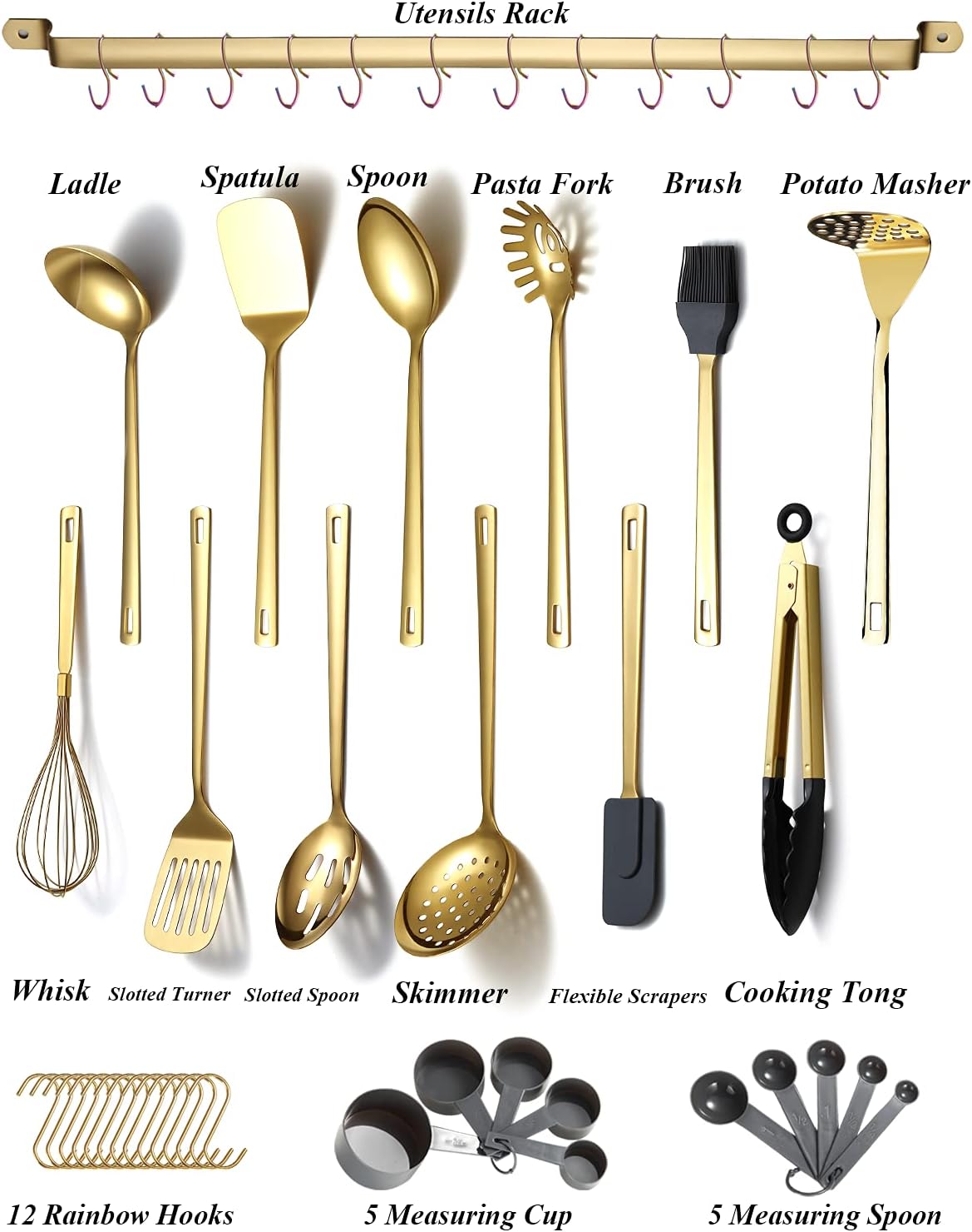 Set de ustensile de gătit Kyraton cu 37 de piese esențiale. Oțel inoxidabil cu placare titan auriu, aspect elegant. Include suport cu 14 cârlige S detașabile. Material sigur, fără plumb și PBA. Ușor de curățat și compatibil cu mașina de spălat vase, ideal pentru uz zilnic.