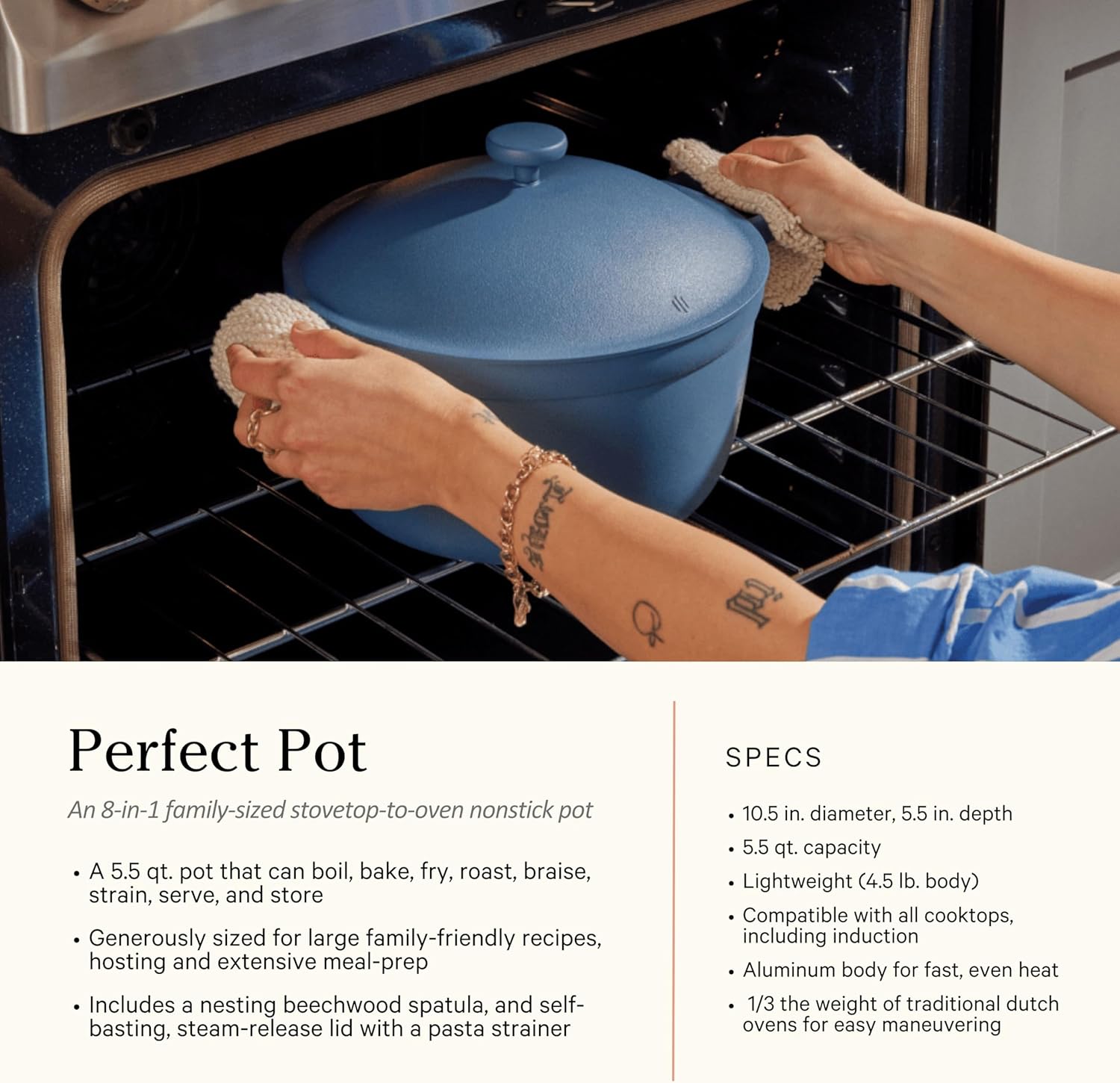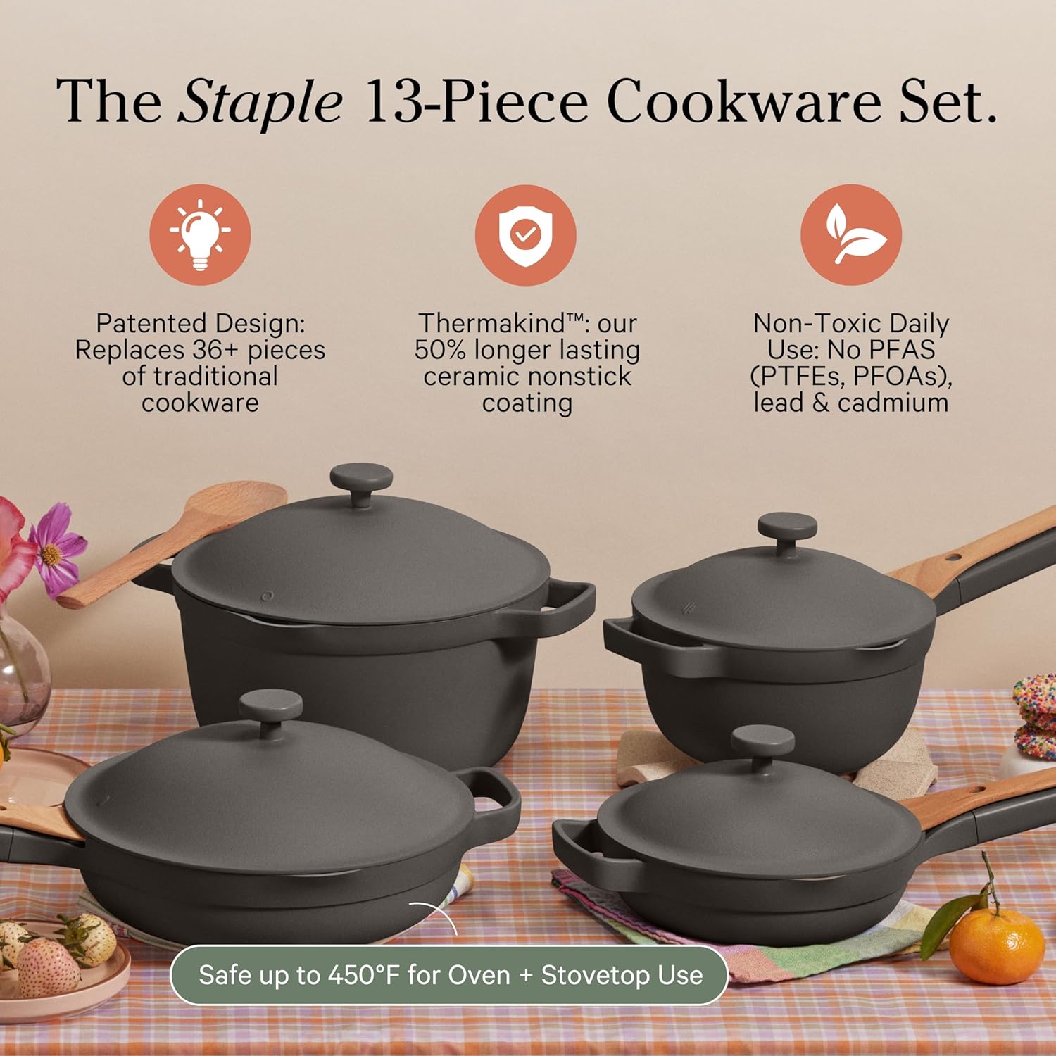 Toate componentele, inclusiv capacele, sunt sigure la cuptor până la 450°F (≈ 232,2 °C). Economisești spațiu, reduci aglomerația și gătești cu încredere de la micul dejun la cină.
