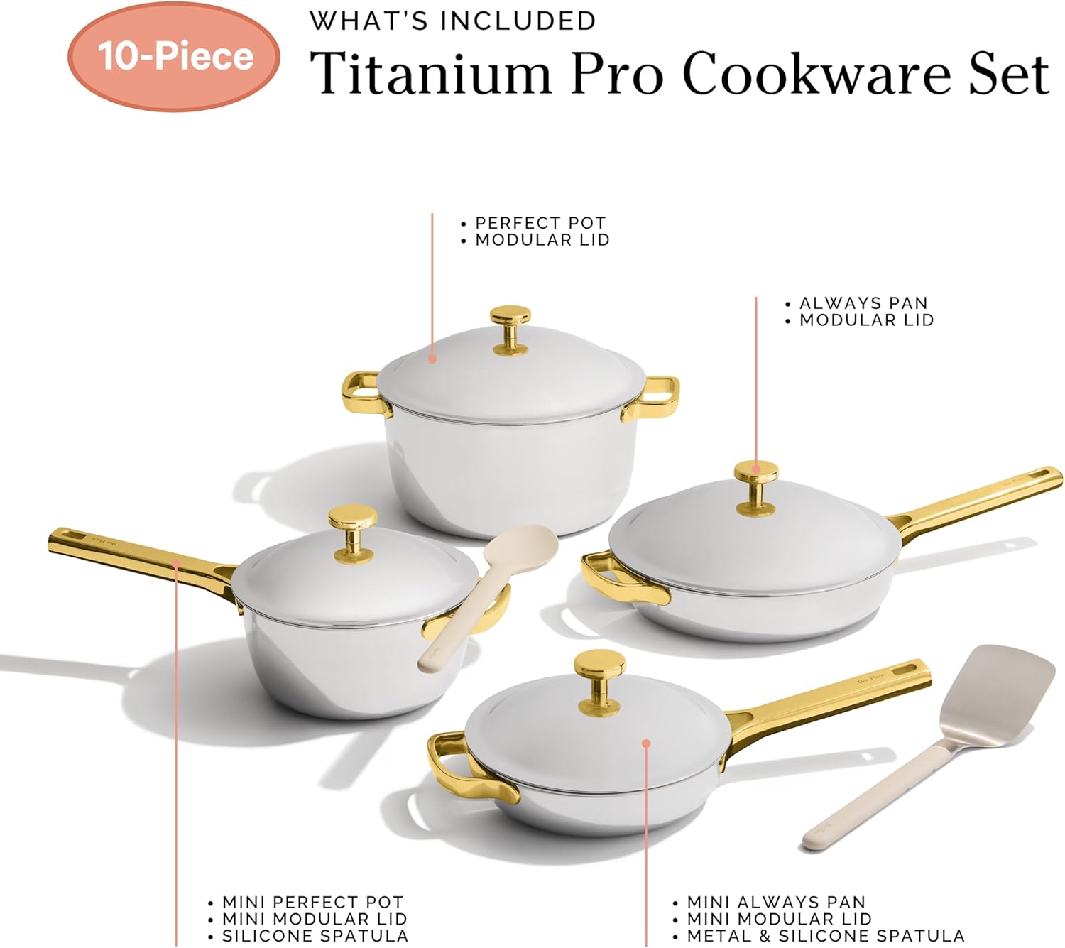 Include Titanium Always Pan Pro, Titanium Mini Always Pan Pro, Titanium Perfect Pot Pro și Titanium Mini Perfect Pot Pro. Tehnologia No-Coating oferă o suprafață natural antiaderentă, fără substanțe toxice sau Forever Chemicals.