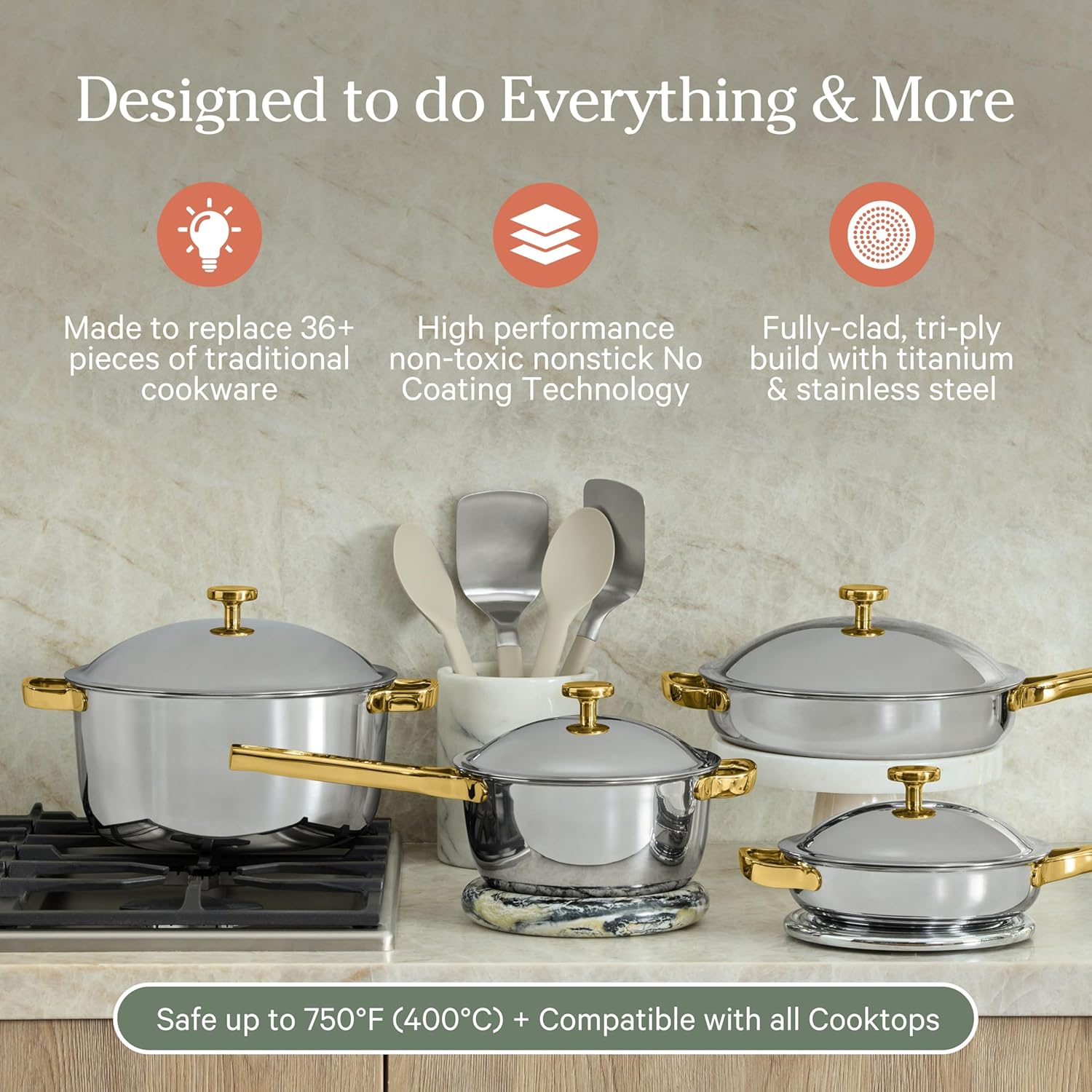 Set Our Place Titanium Pro cu patru piese esențiale pentru gătit zilnic. Suprafață natural antiaderentă, fără Forever Chemicals. Construcție tri-ply durabilă, rezistentă până la 400°C. Compatibil cu toate plitele, inclusiv inducție. Sigur pentru mașina de spălat vase și ustensile metalice.