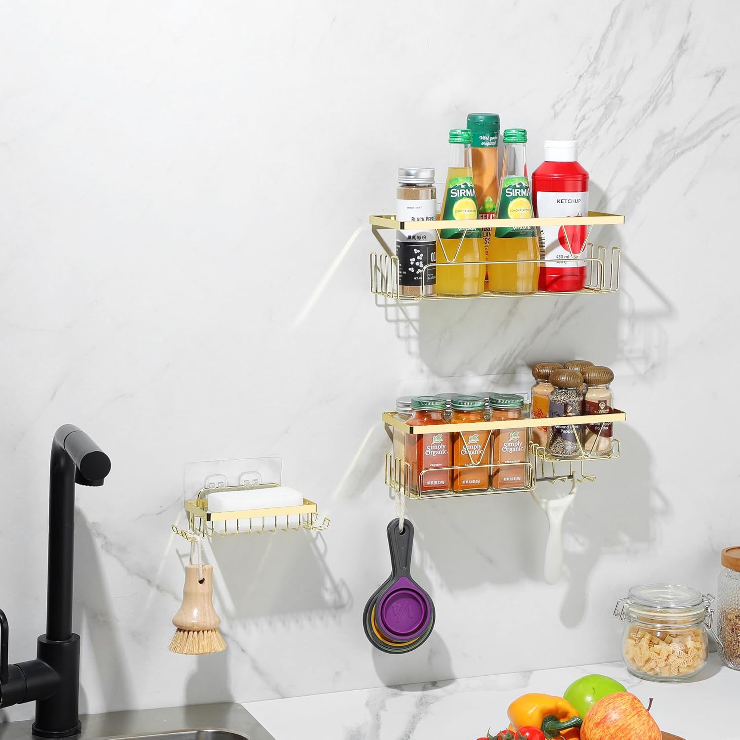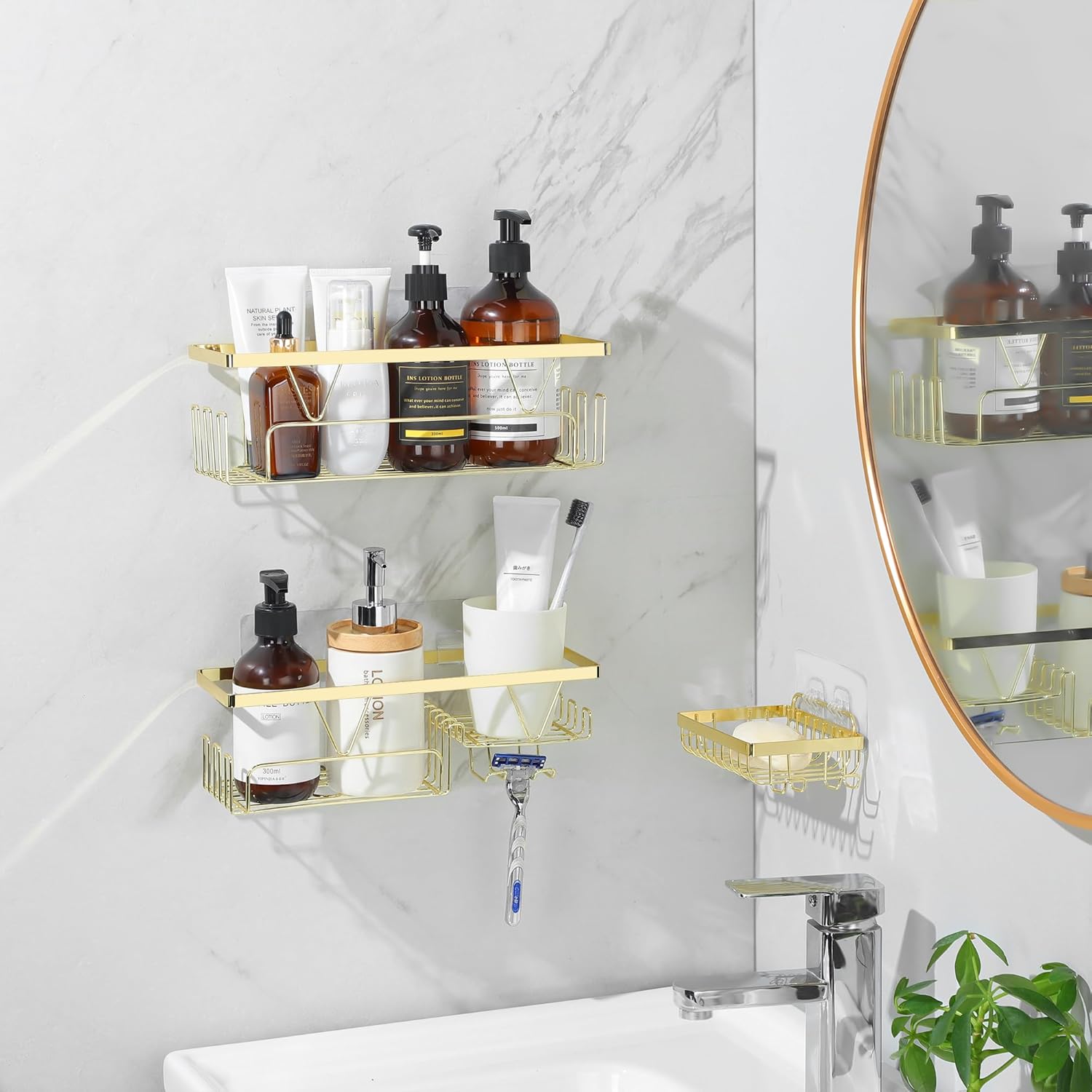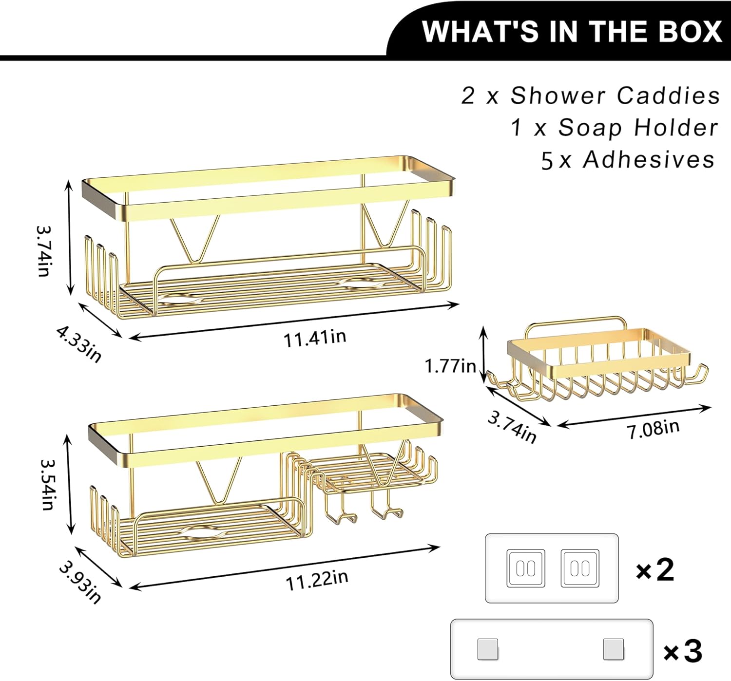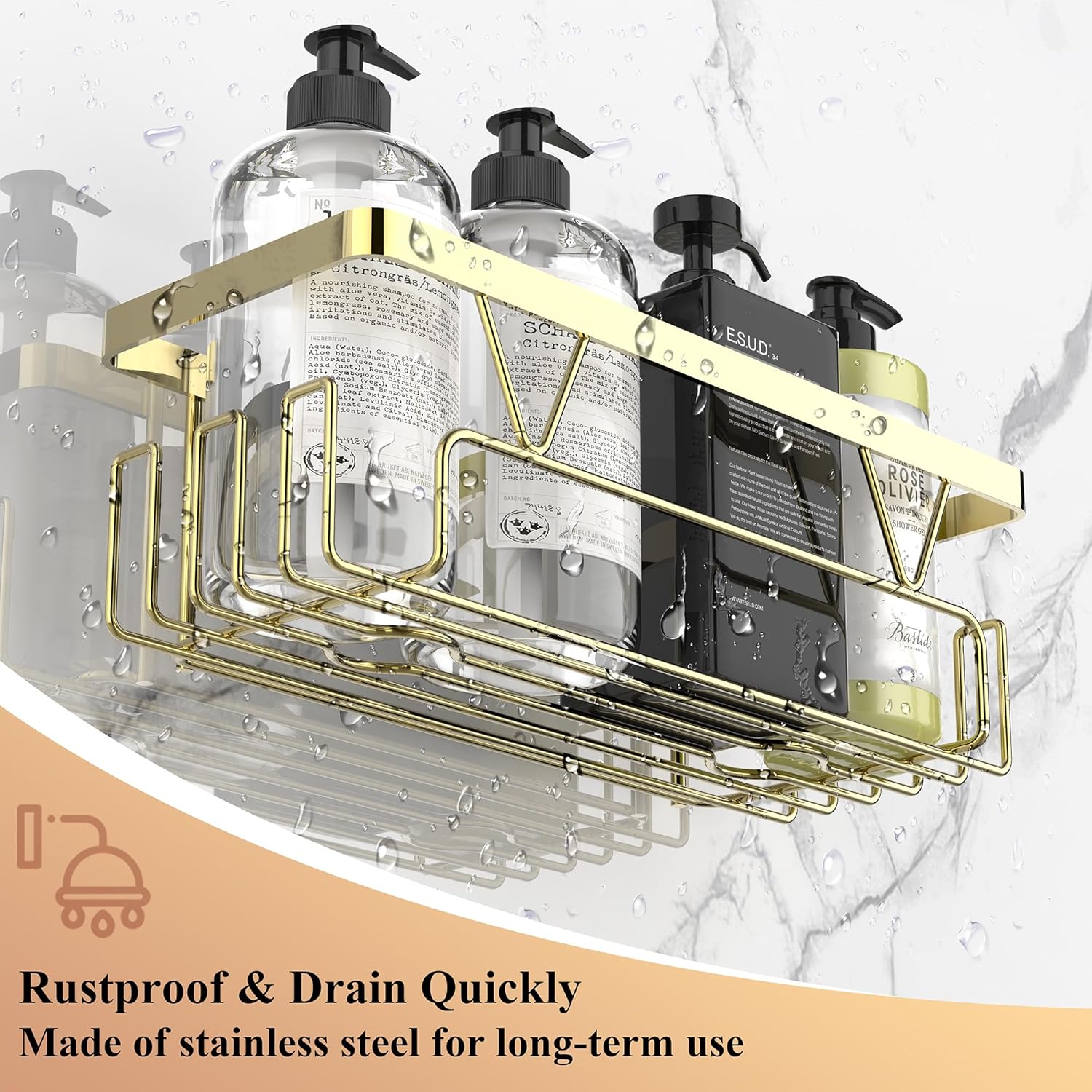 Raft de duș auriu din oțel inoxidabil, cu două shower caddy și suport pentru săpun. Cârlige laterale și pentru razor pentru organizare eficientă. Rezistent la apă și rugină, cu bază decupată pentru drenaj. Adeziv puternic, capacitate de încărcare până la 20KG.