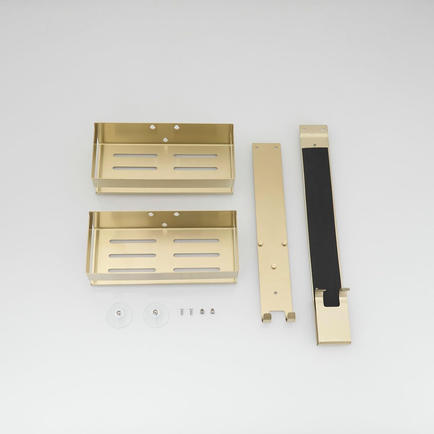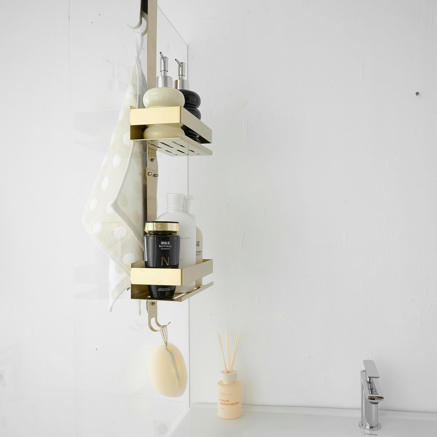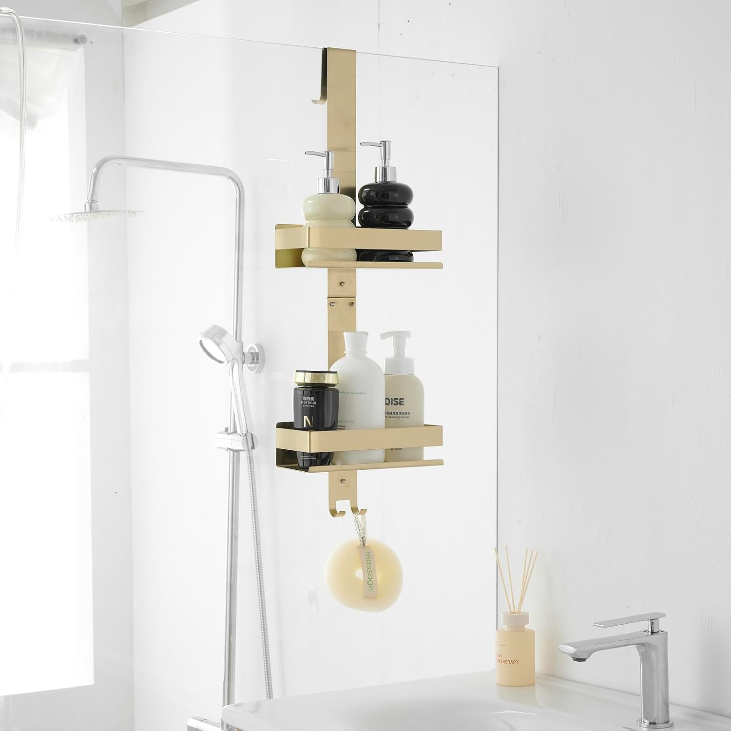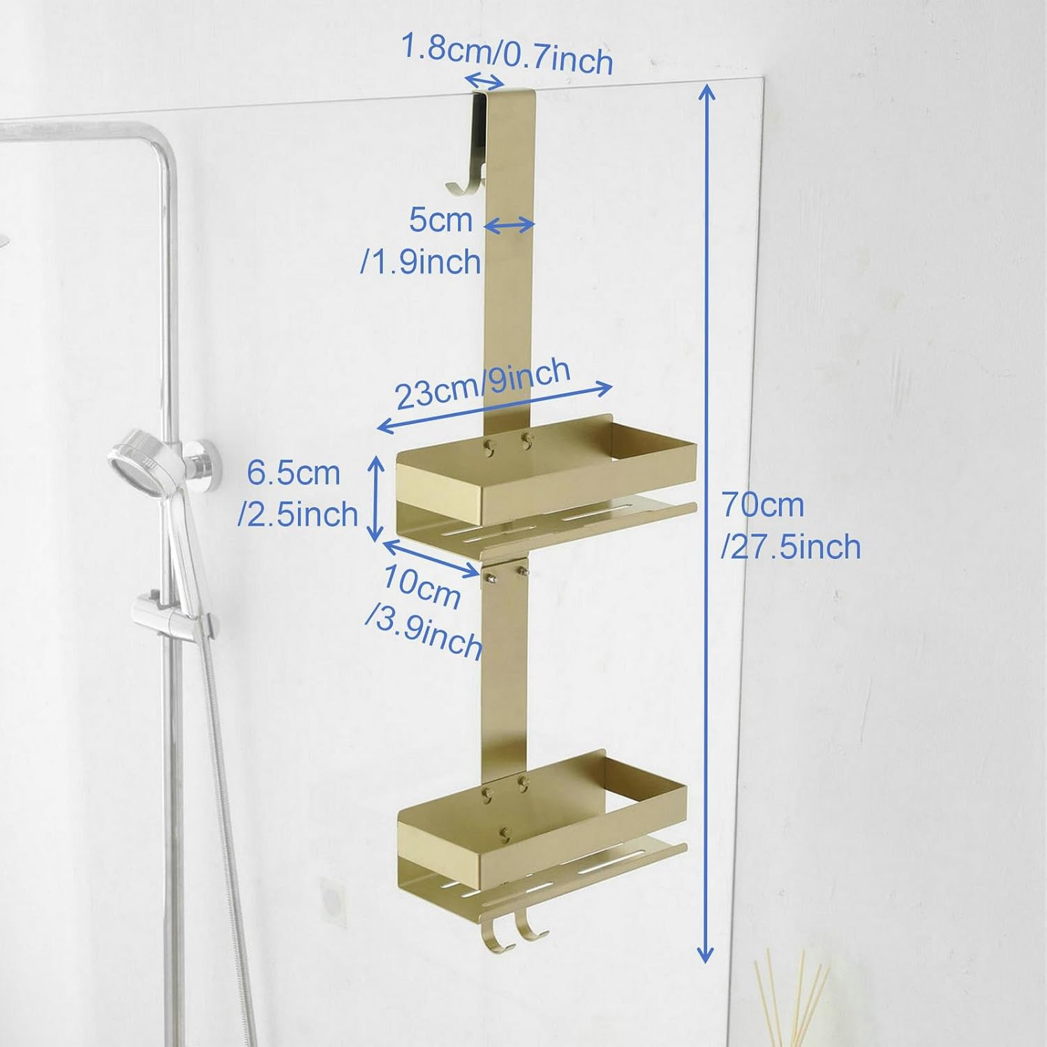 Organizator de duș suspendat, fără găurire, din oțel inoxidabil. Finisaj auriu modern. Include rafturi și cârlige pentru prosoape și accesorii. Potrivit pentru depozitarea produselor esențiale de baie. Greutate maximă admisă 6 kg. Asigurați montajul corect pe ușa de sticlă.