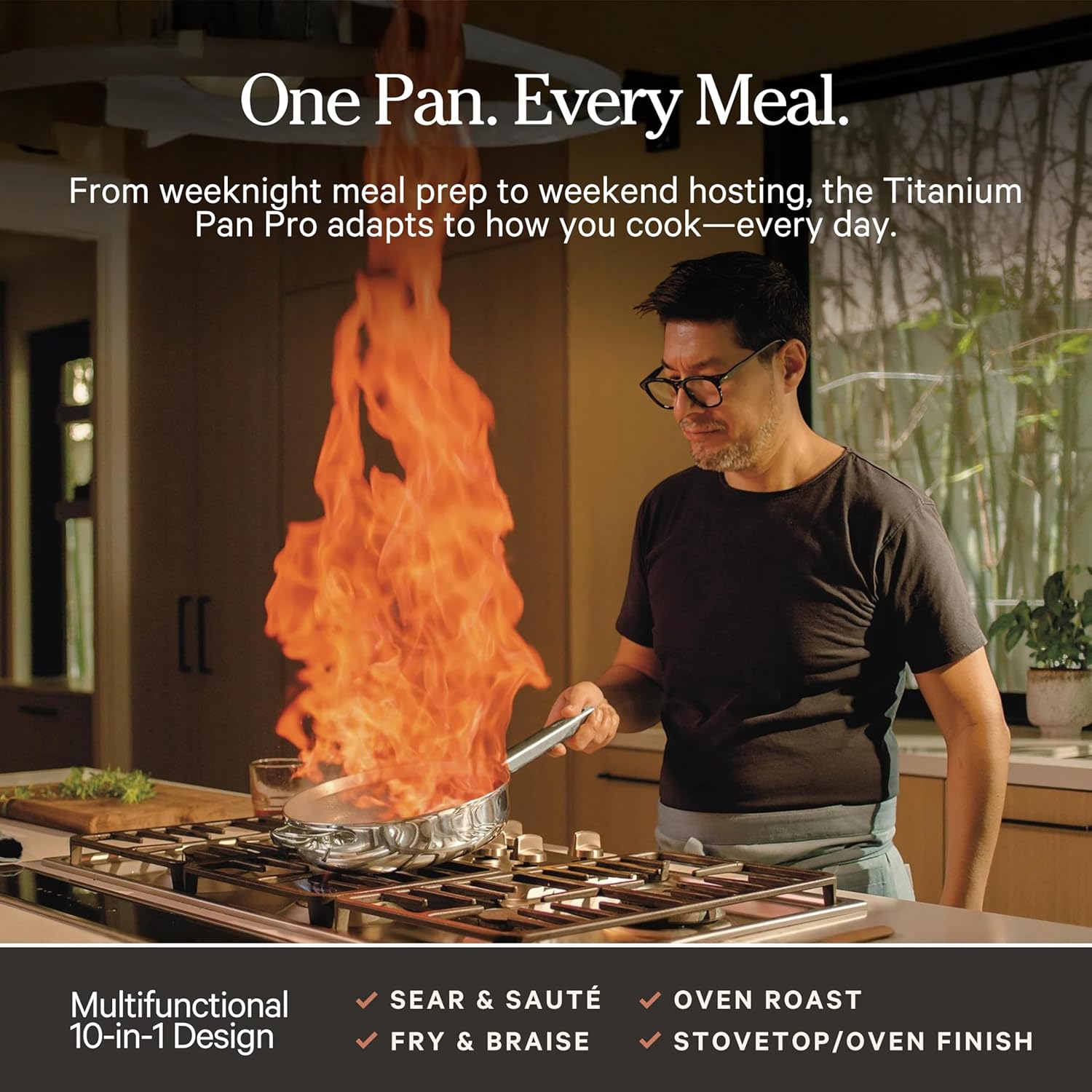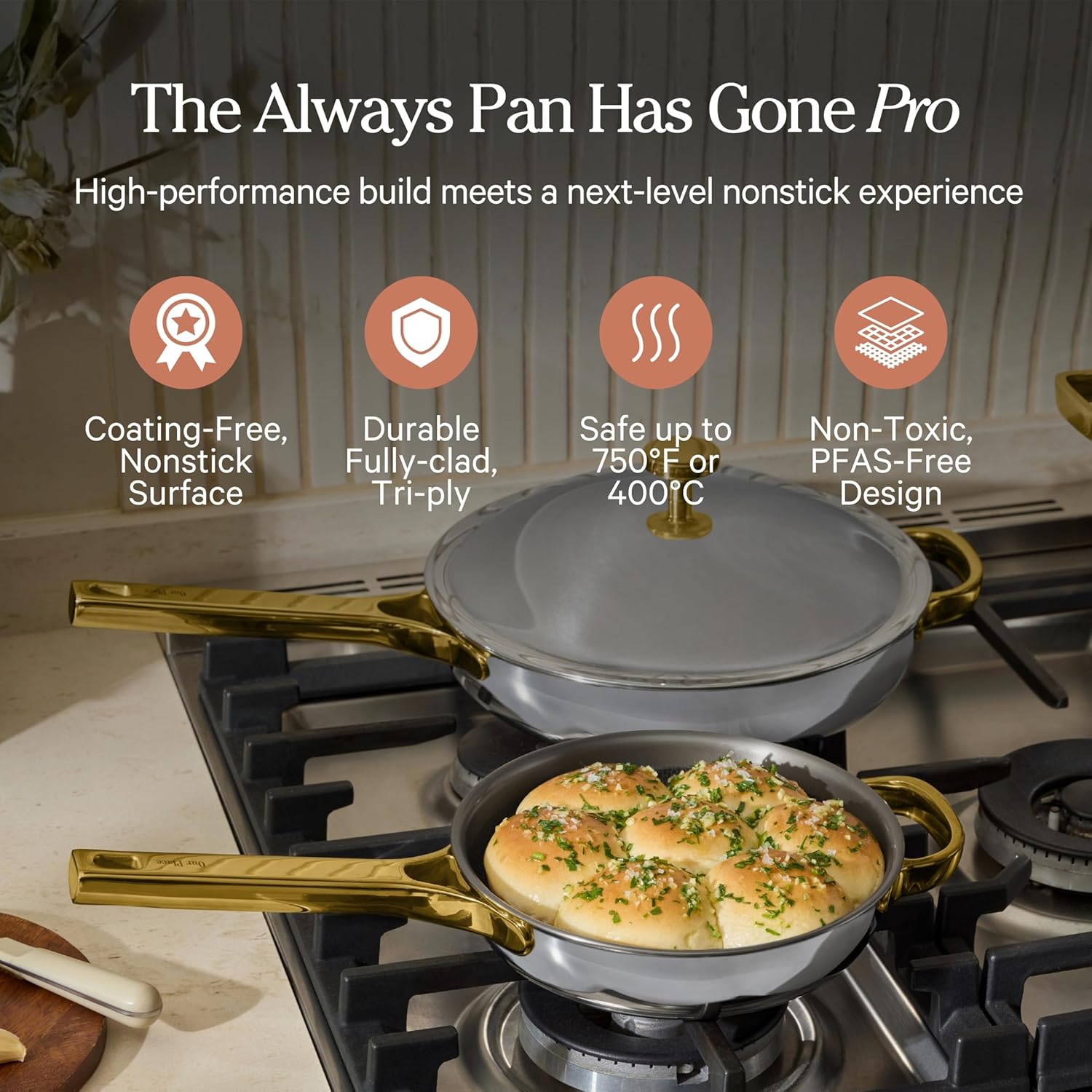 Tigaie Titanium Mini Always Pan Pro cu interior antiaderent fără coating și fără PFAS. Capacitate 1,4 L și diametru 22 cm. Rezistă până la 400°C, compatibilă cu inducție și cuptor. Margine de turnare 360° și sistem de ustensile versatil pentru gătit comod.